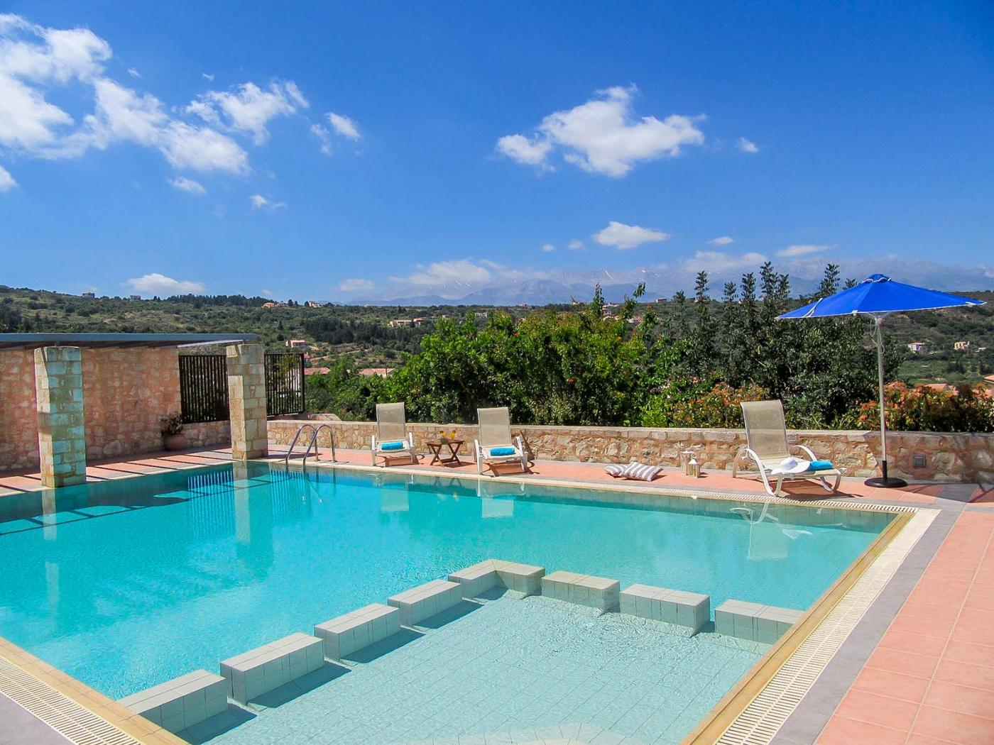 Villa Alkyoni is a beautiful 4-bedroom villa that can host comfortably 10 guests. There is a master bedroom with king size bed, en-suite bathroom with Jacuzzi and shower and a private terrace. A second master bedroom offers queen size bed, en-suite bathroom with Jacuzzi and shower and private terrace.  In the villa there are also 2 twin bedrooms (can be made to double) that share 1 large bathroom with a shower. Each bedroom has its own balcony equipped with chairs and table. All bedrooms have their own TV.