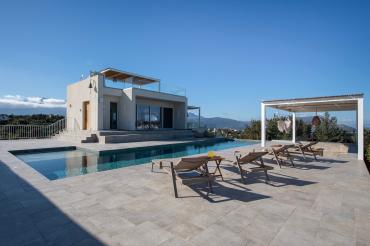 The spacious accommodation hugs the landscape over three levels, providing a large open-plan lounge and dining area under a beautifully crafted, vaulted ceiling, a fully integrated open-plan Siemens kitchen and three double bedrooms with spa jet en-suite bathrooms, a family bathroom and private terraces or balconies. All rooms are serviced with sumptuous fan cooling and underfloor cooling (heating in winter). Designed with meticulous attention to the outdoor spaces, the villa is wrapped by extensive terraces, which in turn give way to beautiful lawns, flower beds and meandering stone paths fringed by old oak, carob and olive trees - so internal and external living flows almost imperceptibly into one another.