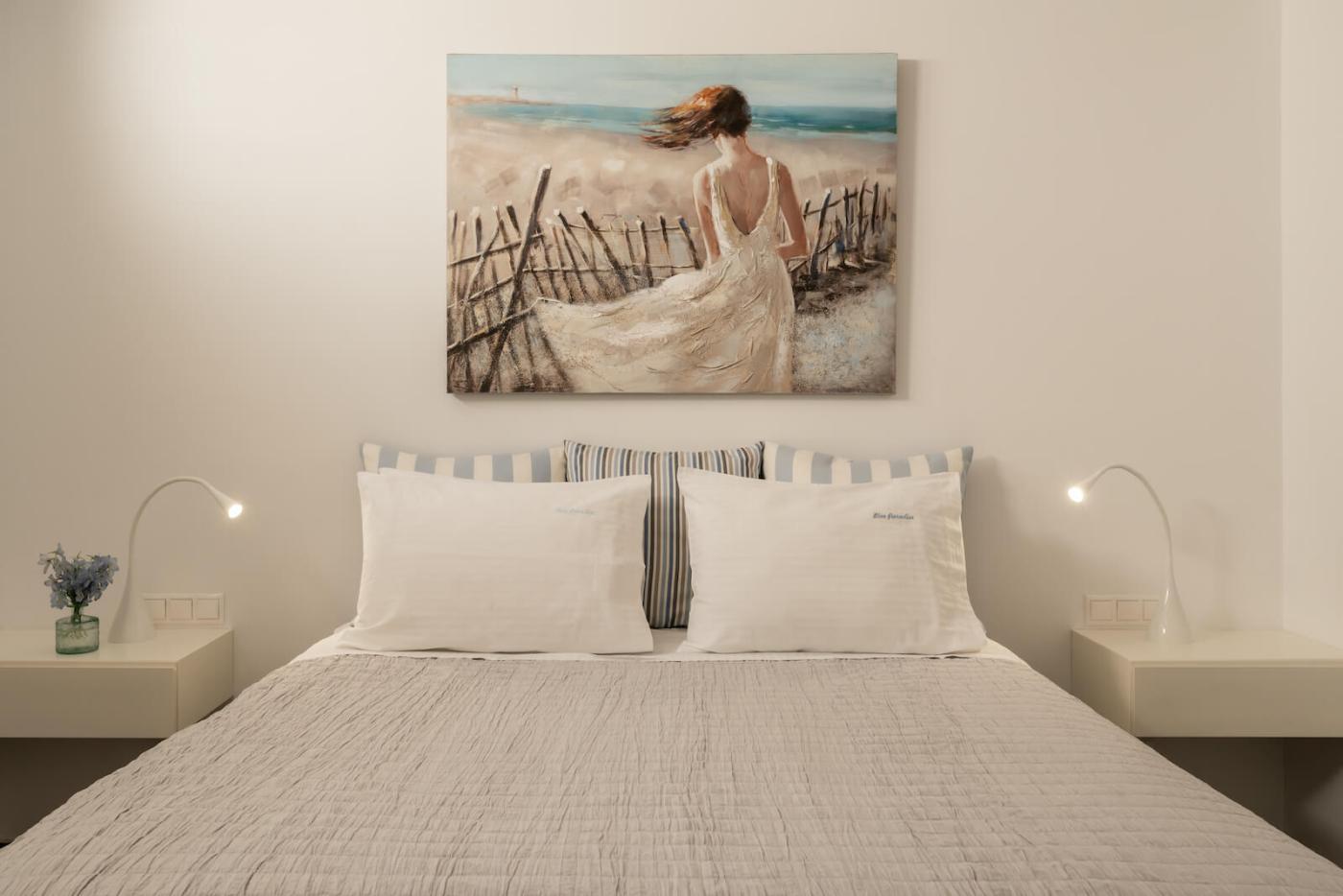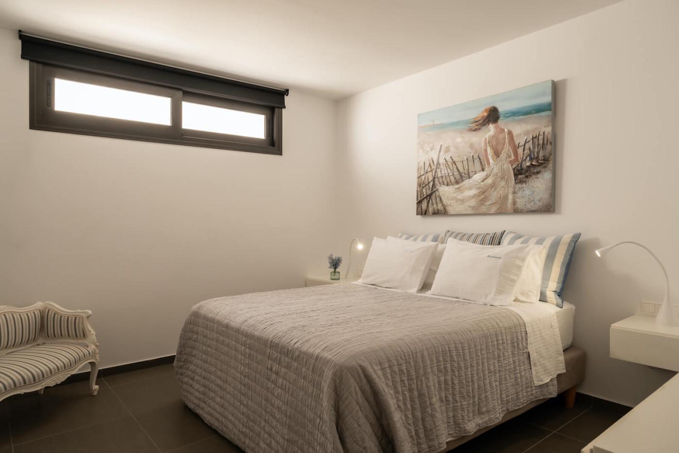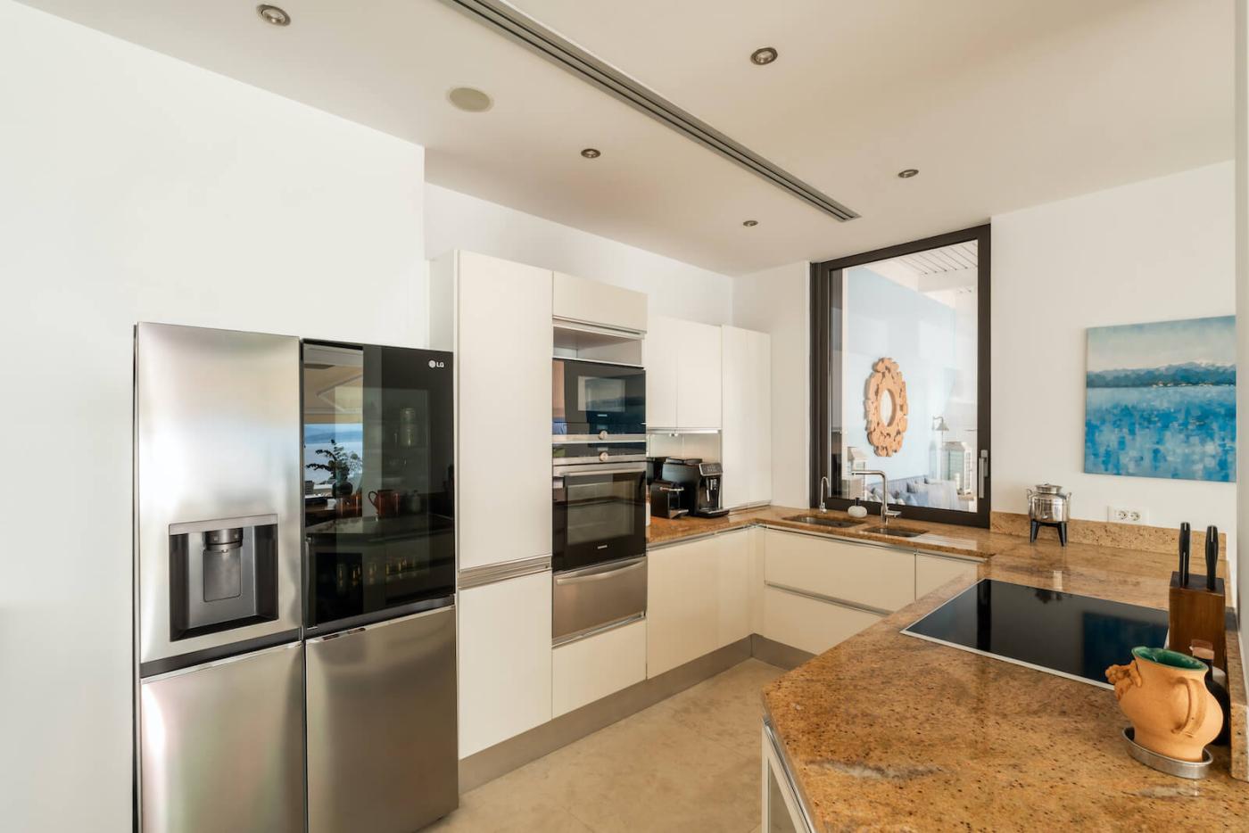 On the second floor, which you can access with the elevator or the stair case, there is a second master bedroom with queen size bed and en-suite bathroom, sea views and access to the spectacular garden.The third bedroom has two twin beds, an amazing sea view, covered terrace with a daybed and exercise equipment for its guests to use.