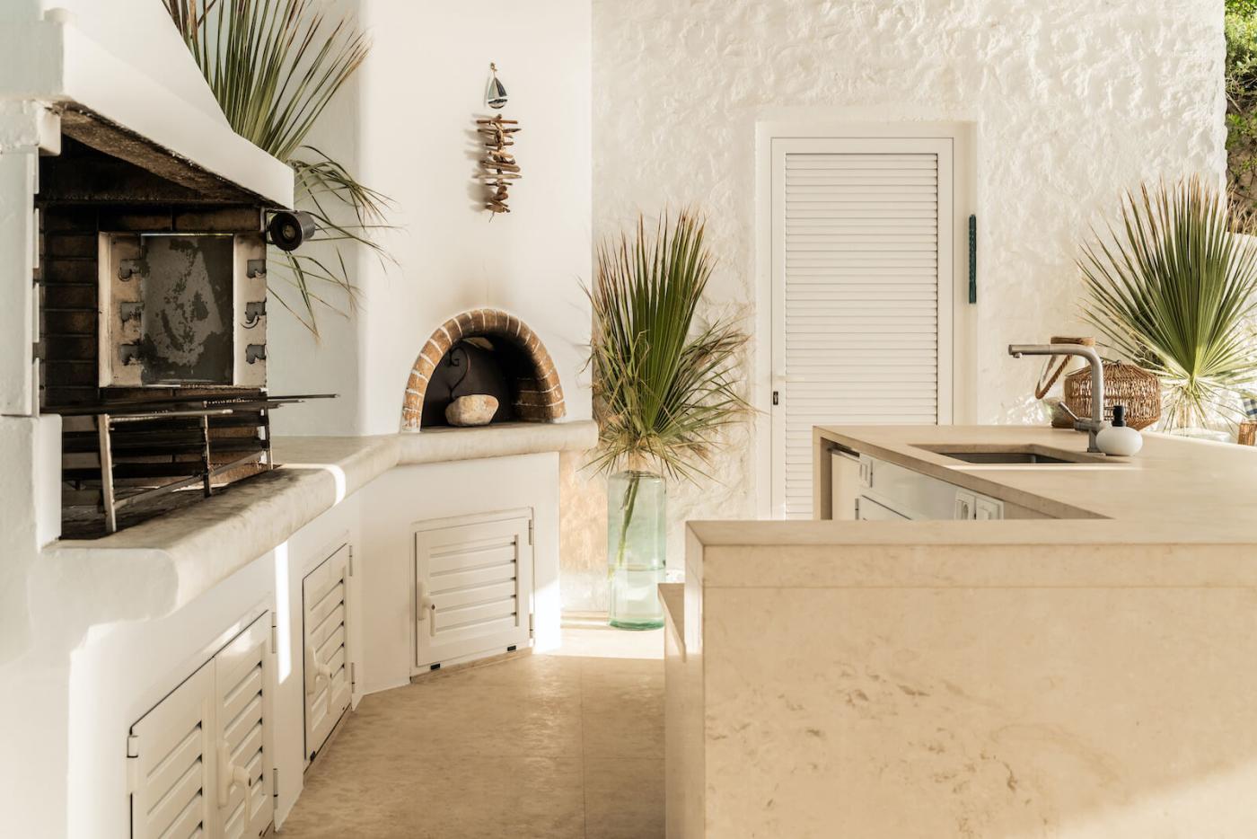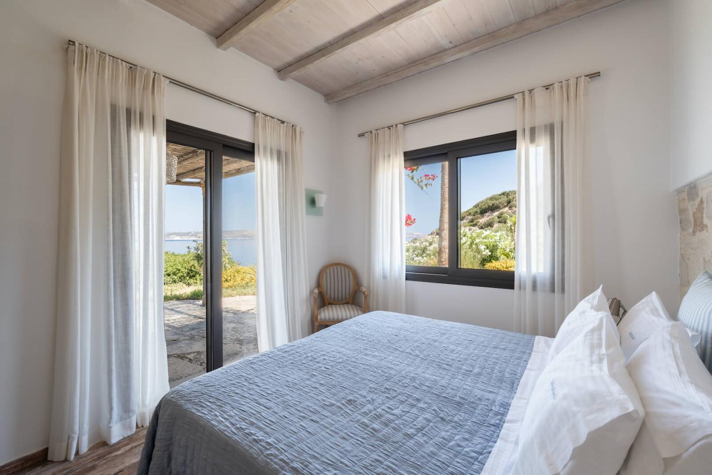 On the ground floor of the main villa there is the master bedroom with a king size bed, en-suite bathroom with alfresco shower, gorgeous sea views and outside a fully furnished covered terrace for sitting on a hot summers night.
