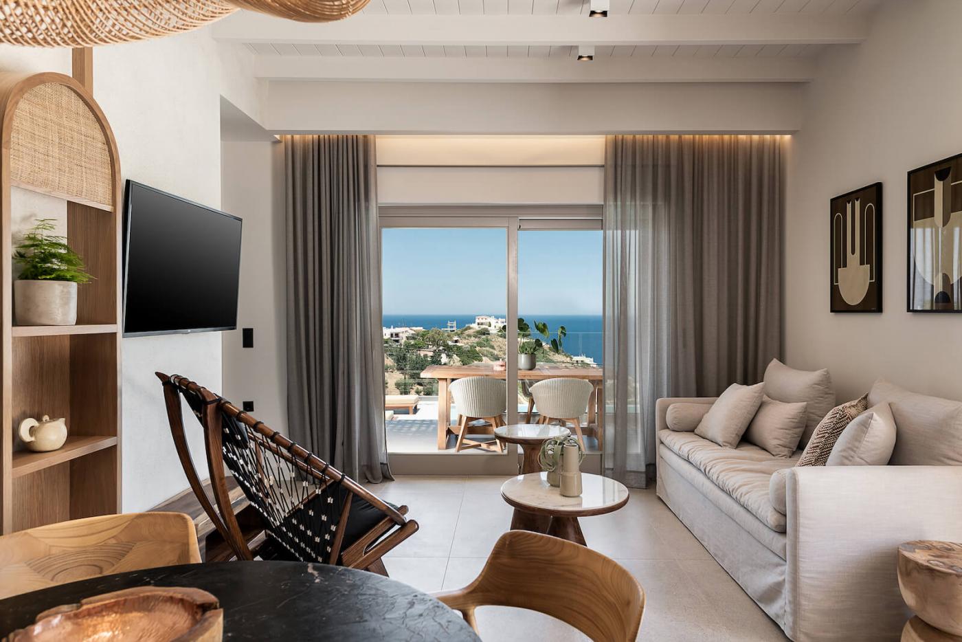 The villas are characterized by high aesthetics and stunning panoramic views of the Cretan Sea. The earthy tones of the spaces merge into the deep blue of the sea and sky, offering an unforgettable sense of harmony and gentleness. Every aspect, material and element has been carefully selected to wrap you in a state of calmness and satisfaction. All you need to do is enjoy.