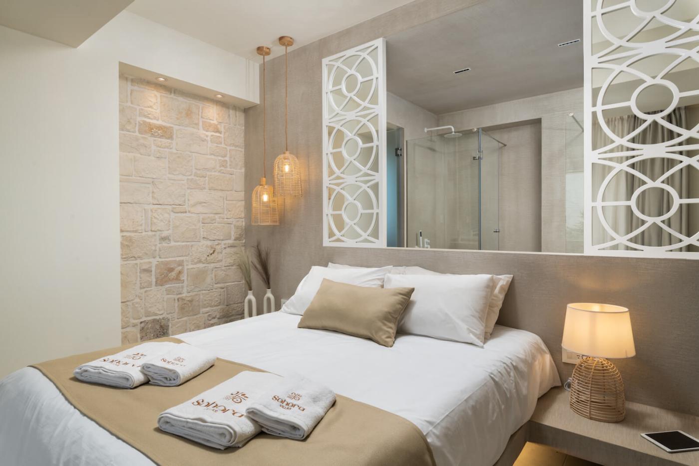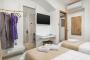 On the ground floor, you will find a fully equipped kitchen for the preparation of any kind of meal, a bedroom with a double bed, and a shared WC. Ascending to the first floor, you’ll discover two additional bedrooms - one with a double bed and the other with two single beds. All bedrooms are equipped with Coco Mat layers (Dimensions: 160x200cm, 160x200cm, 90x200cm, 90x200cm). A practical washing and ironing area completes the spaces on this floor. Each bedroom has its own bathroom for comfort and privacy. Particular emphasis has also been placed on the selection of the anatomical mattresses for all beds by the company Cocomat, which ensures a rejuvenating sleep experience, comfort and rest throughout your stay. As you make your way to the Roof Garden, you will discover a landscaped area with comfortable seating and a jacuzzi, offering stunning views of the enchanting sea - the perfect setting for delightful moments of relaxation.