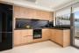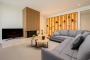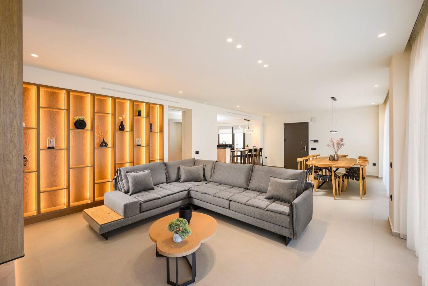 Inside, the villa blends minimal design with warm natural tones. The spacious living area, featuring a wooden bookcase and energy fireplace, flows seamlessly into a fully equipped designer kitchen and elegant dining room.