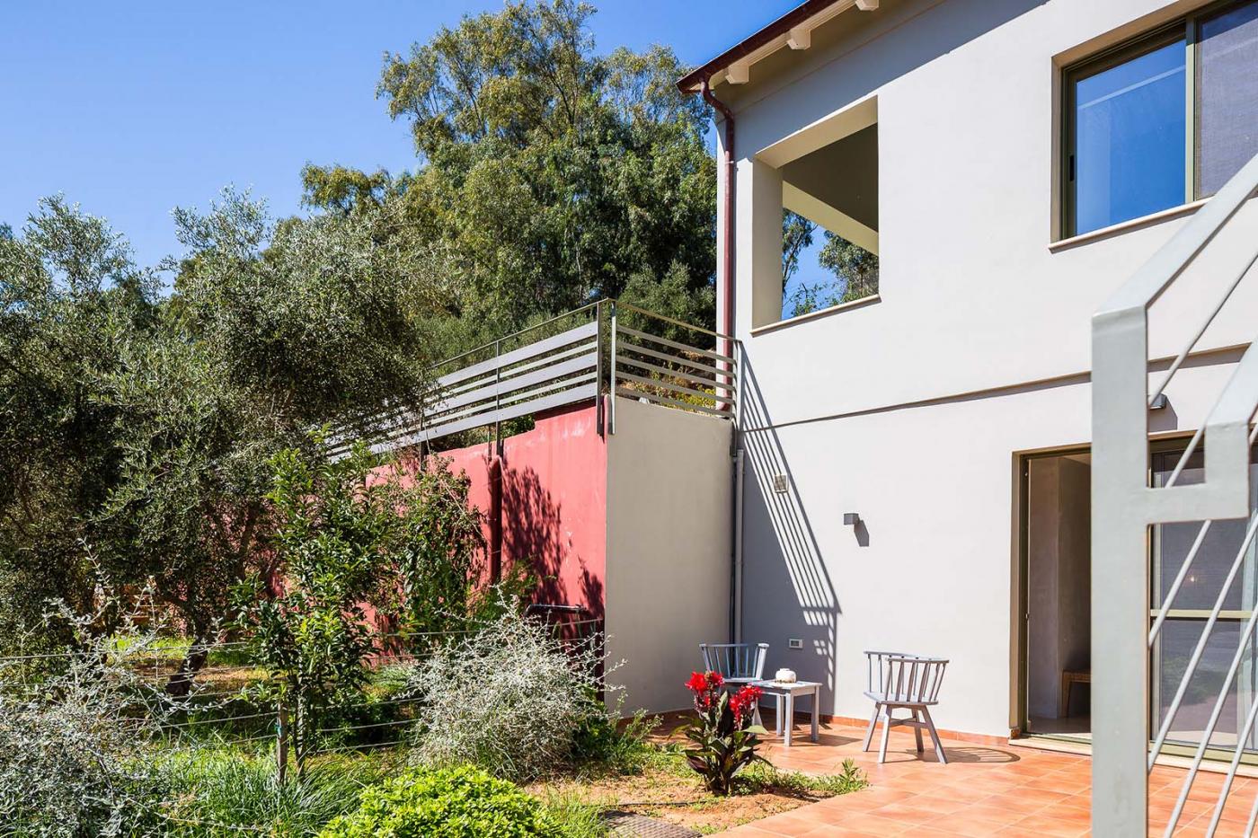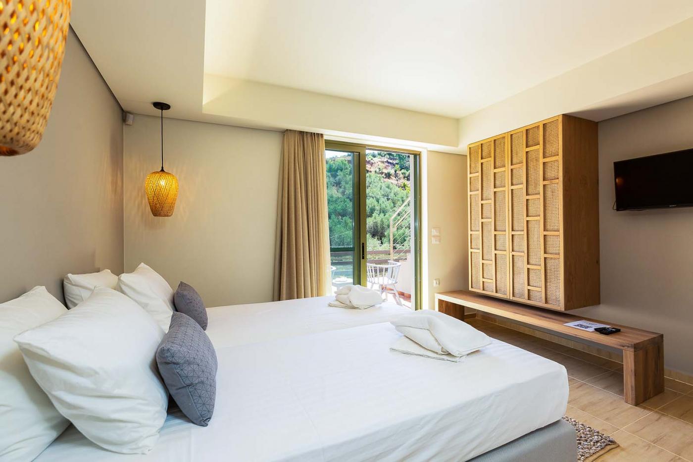 Villa Thalia features 2 double rooms with fully-equipped bathrooms. There is a large living area with a fireplace and own fully-equipped bathroom, thus it can accommodate one more guest. There is also a fully-equipped kitchen with beautiful views of the hill with the olive trees. In the extension of the living area and the kitchen, there is a private pool and a fruit and local herb garden, along with a small vineyard that produces grapes throughout the summer season.