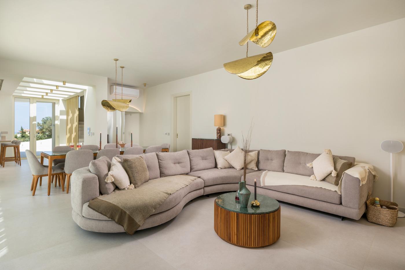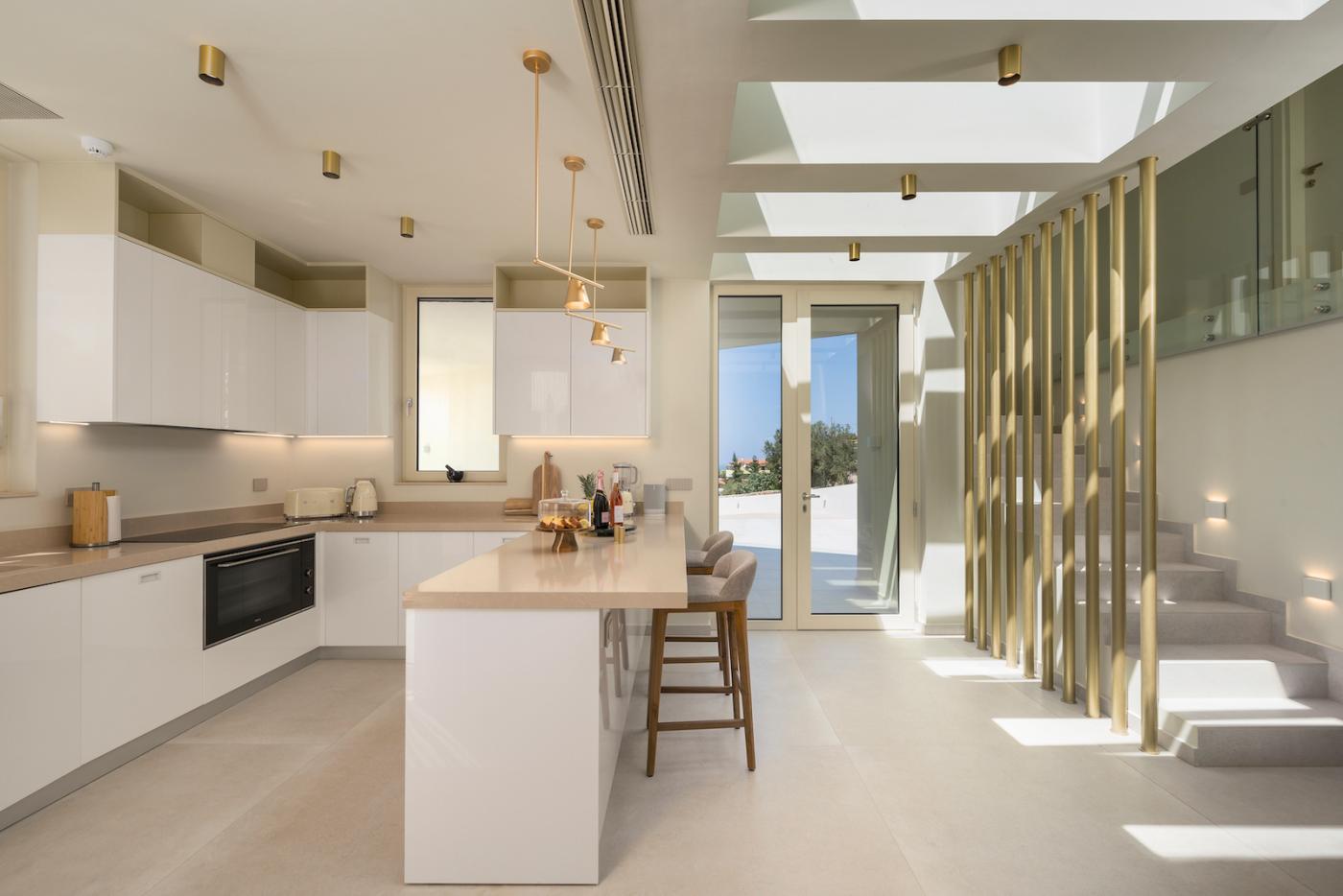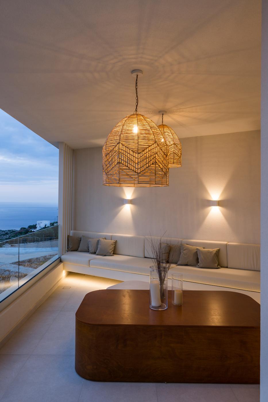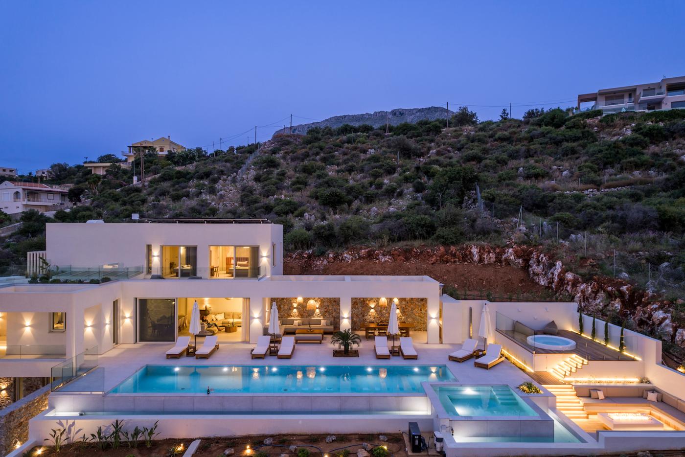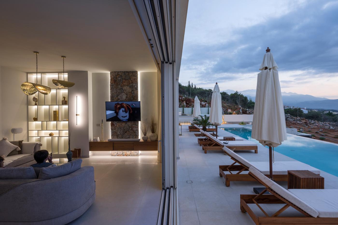 This villa offers a perfect blend of modern design and natural Cretan terrain, with the use of onyx, luxurious gold details, natural stone, iroko decking, and bespoke furniture constructions throughout the house. The luxury bespoke lighting fixtures add to the overall ambiance of the villa.