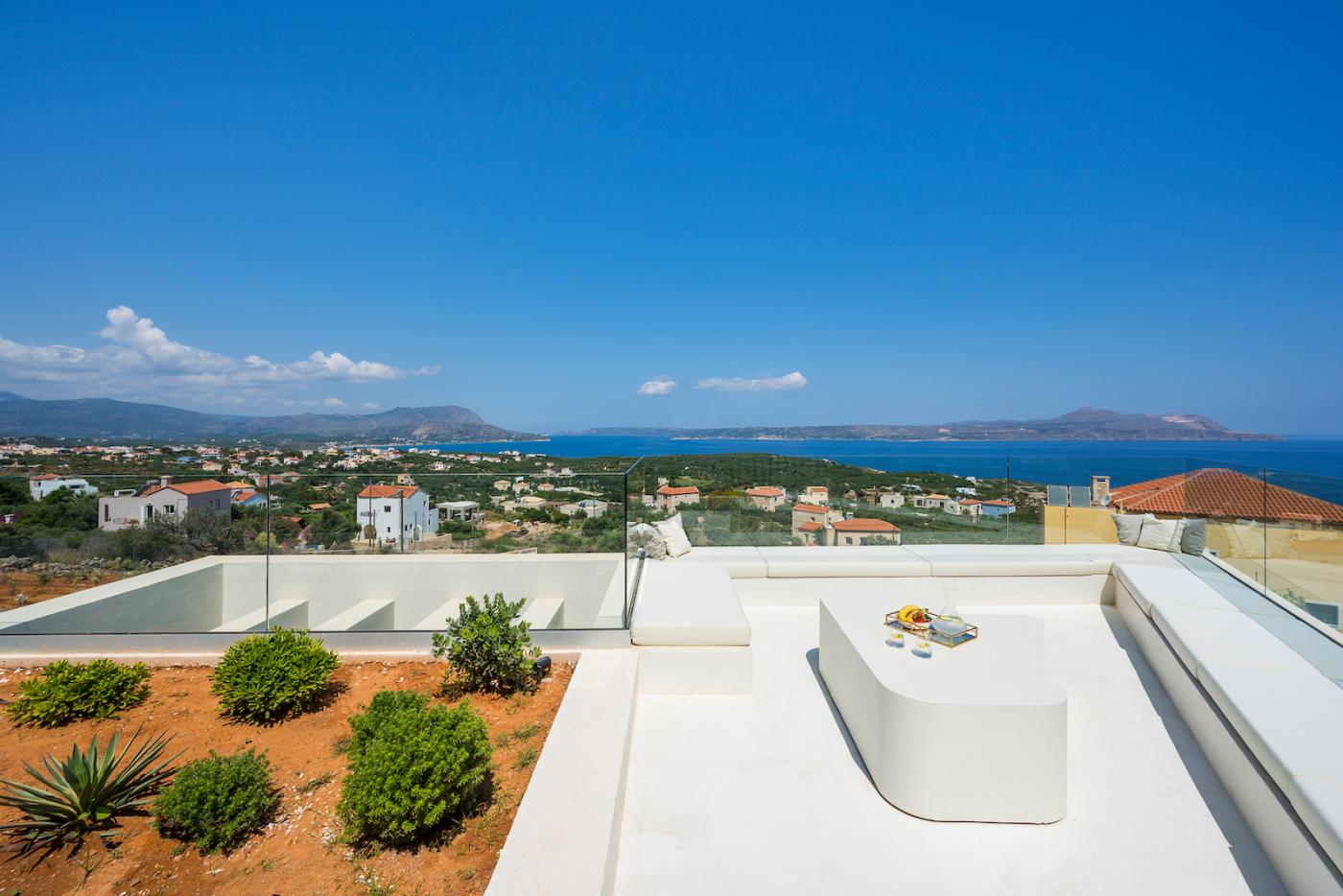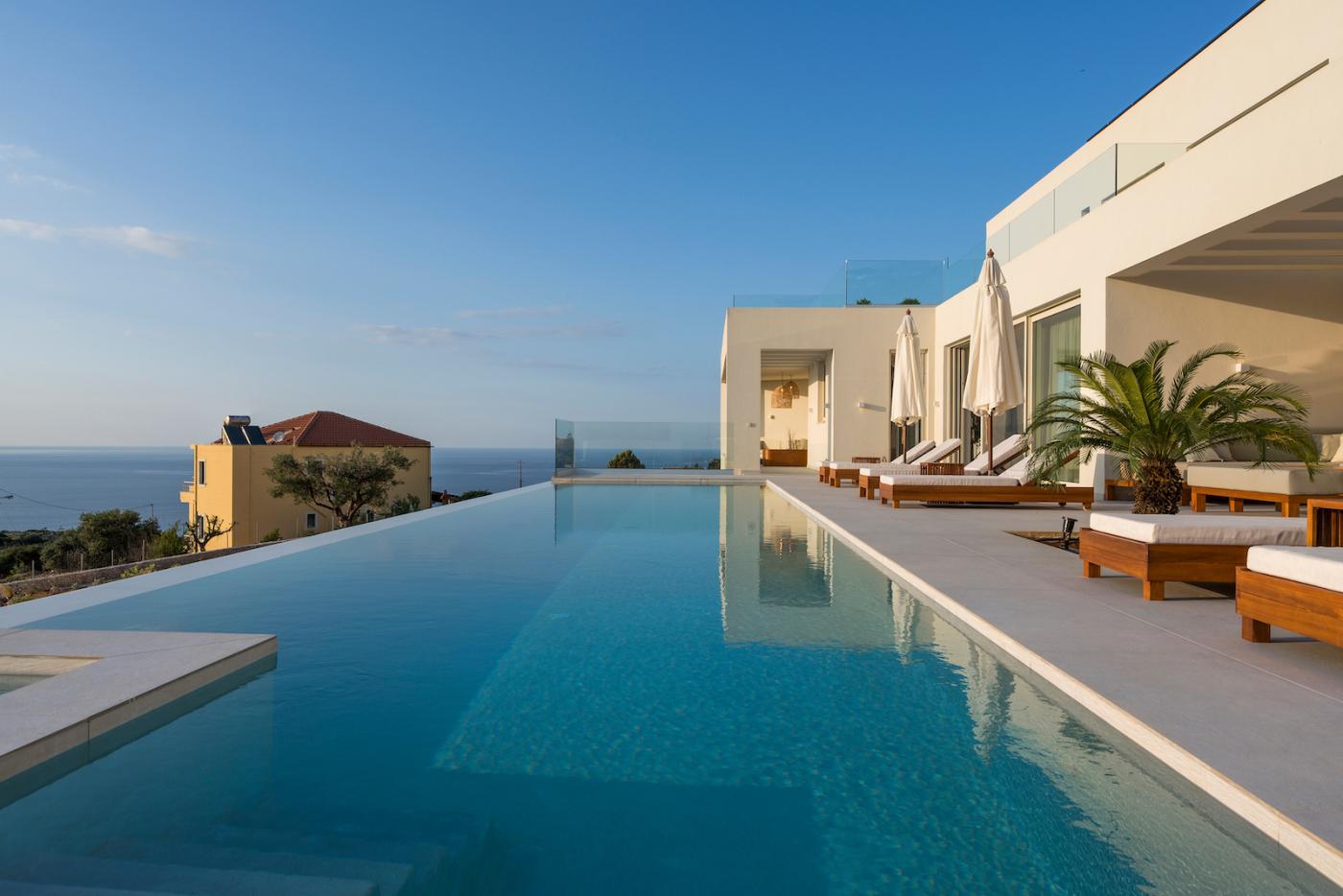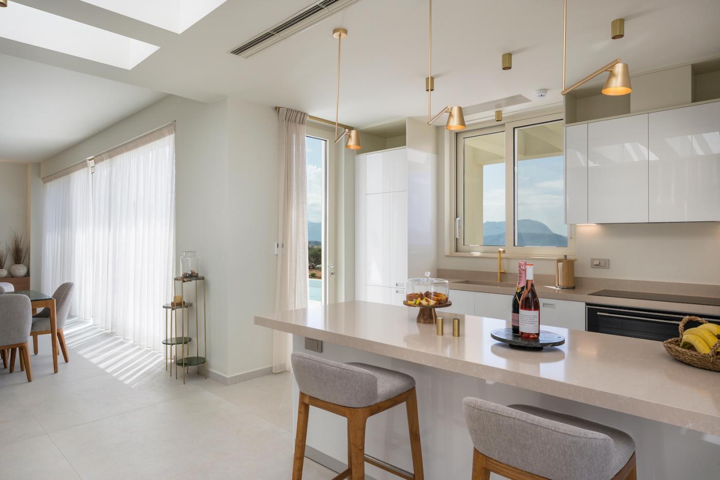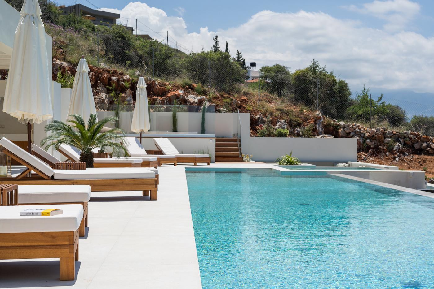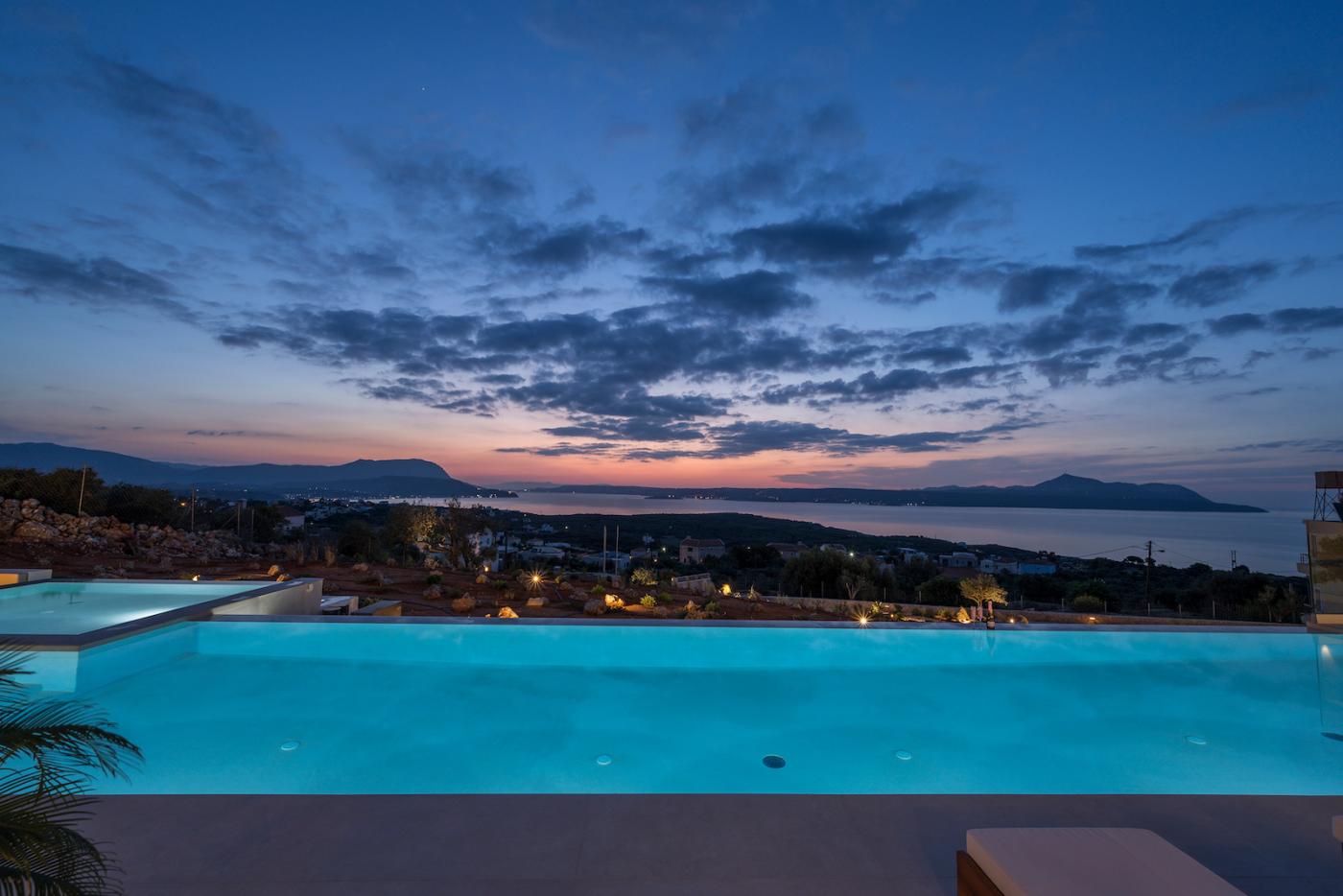 This villa offers a perfect blend of modern design and natural Cretan terrain, with the use of onyx, luxurious gold details, natural stone, iroko decking, and bespoke furniture constructions throughout the house. The luxury bespoke lighting fixtures add to the overall ambiance of the villa.