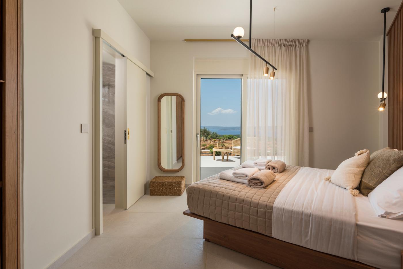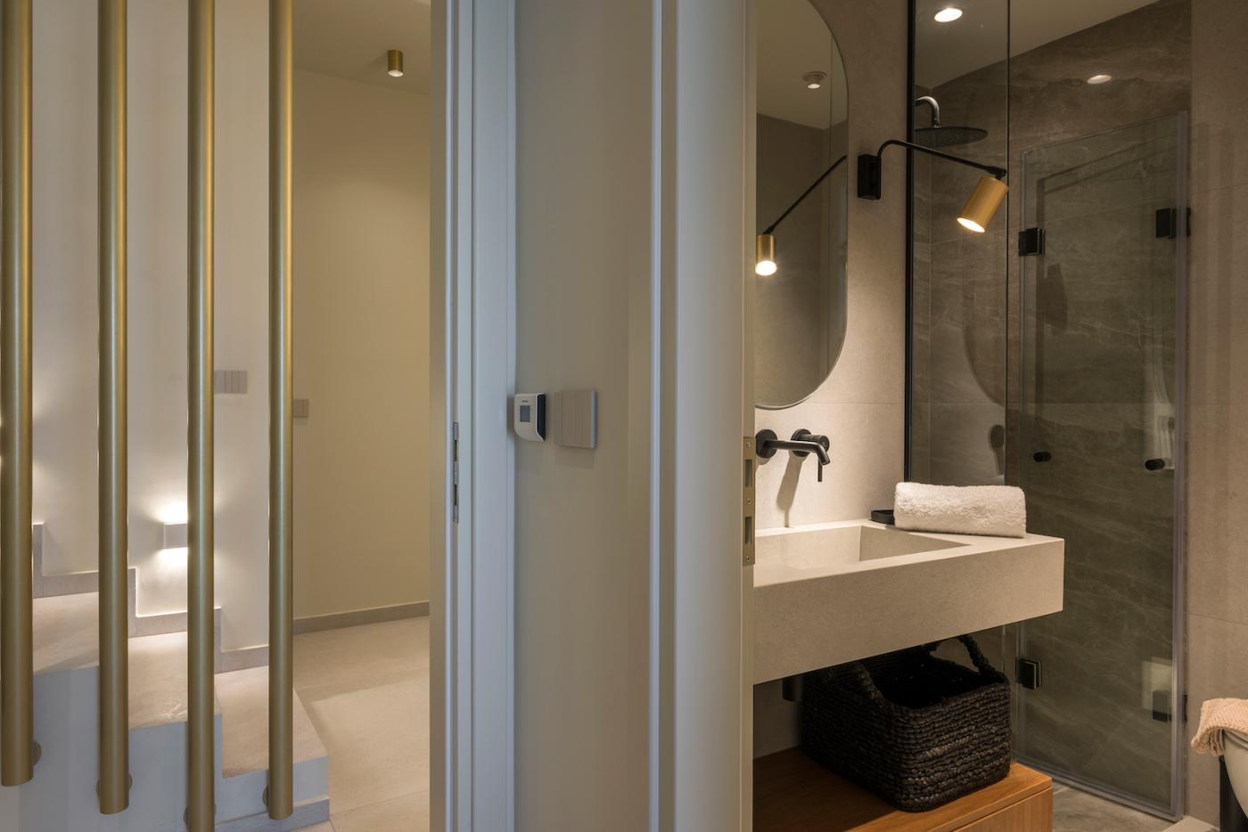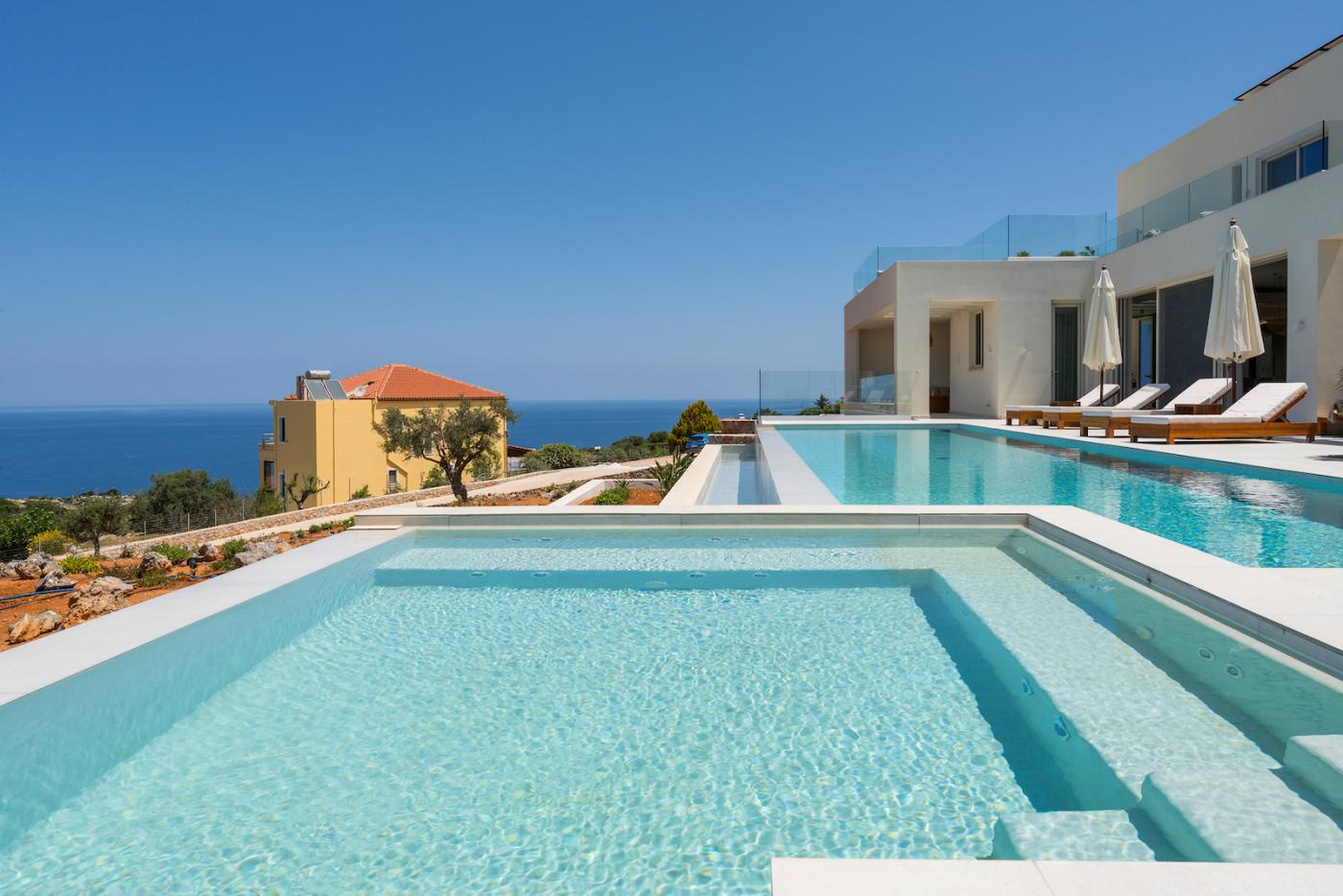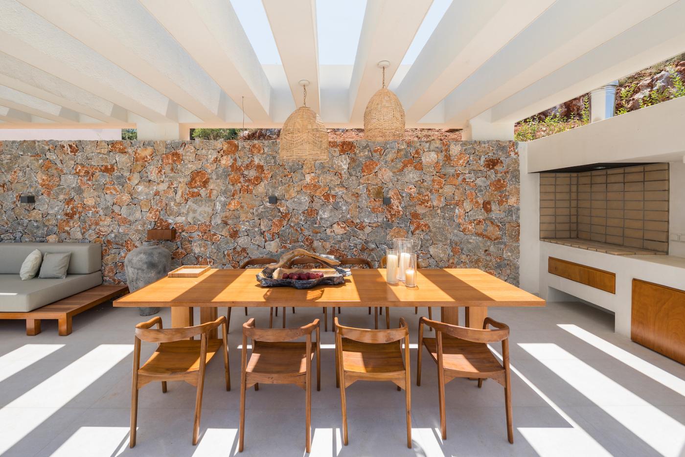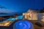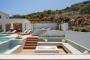 This villa offers a perfect blend of modern design and natural Cretan terrain, with the use of onyx, luxurious gold details, natural stone, iroko decking, and bespoke furniture constructions throughout the house. The luxury bespoke lighting fixtures add to the overall ambiance of the villa.