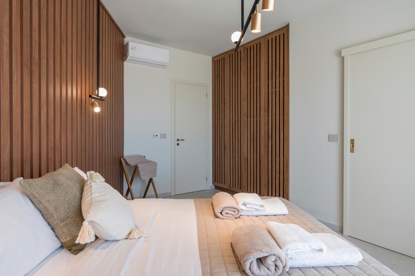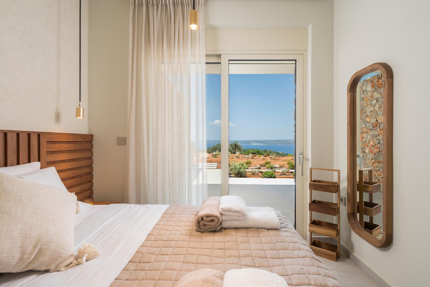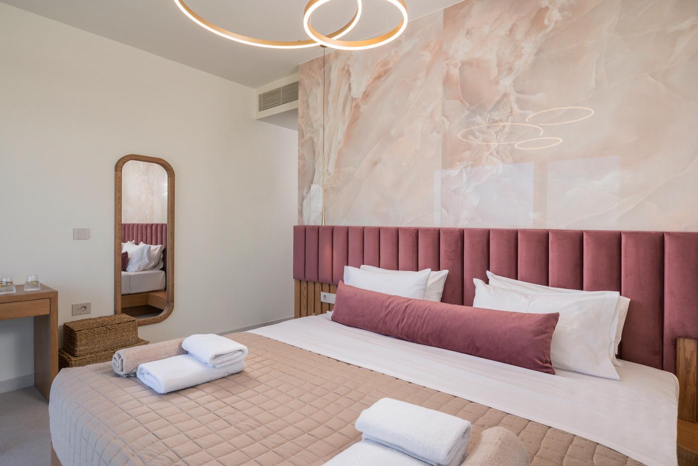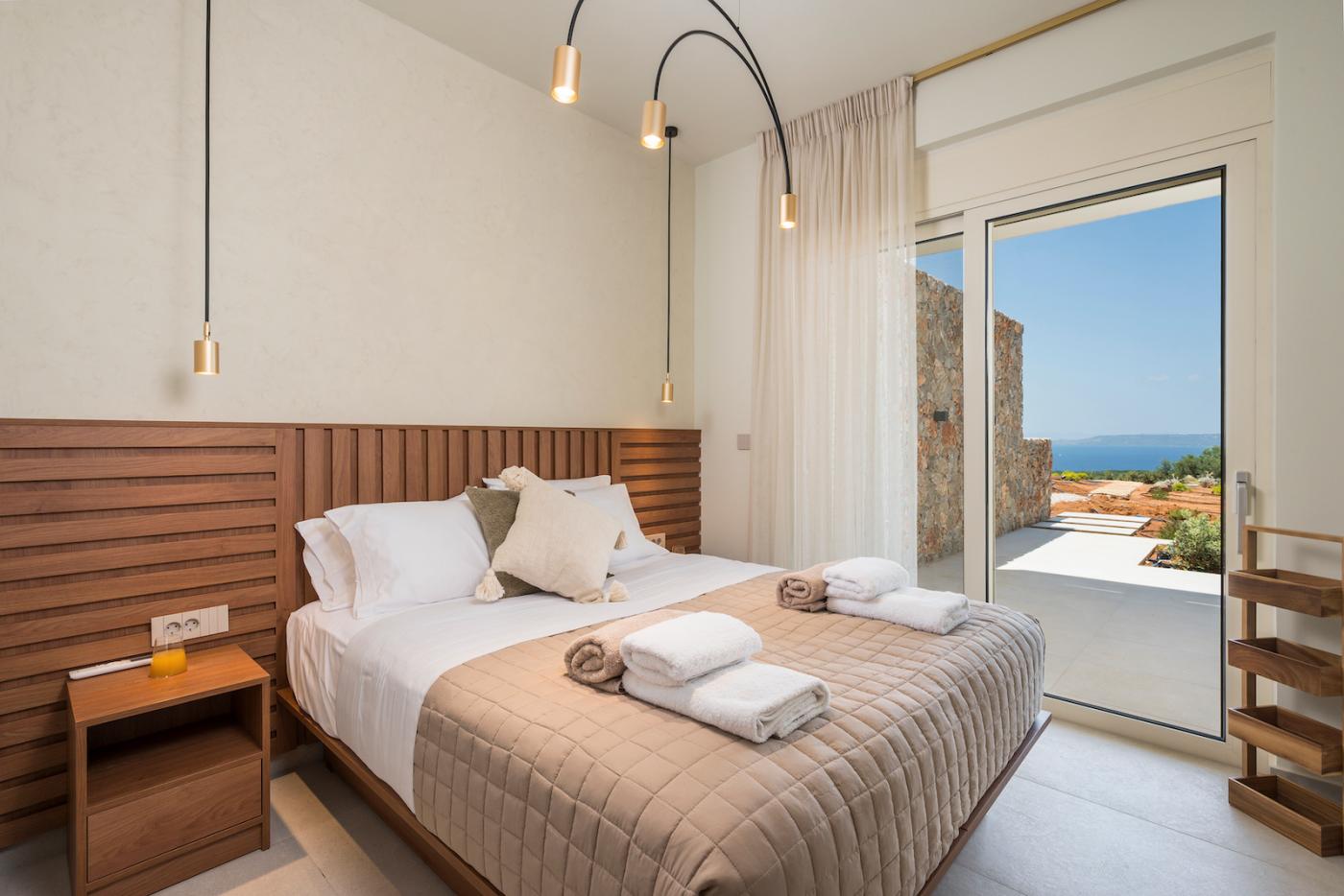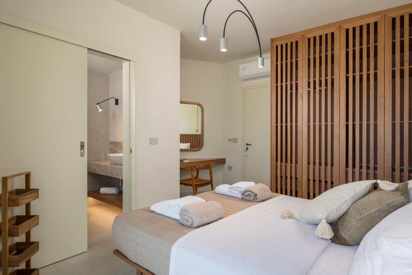 This villa offers a perfect blend of modern design and natural Cretan terrain, with the use of onyx, luxurious gold details, natural stone, iroko decking, and bespoke furniture constructions throughout the house. The luxury bespoke lighting fixtures add to the overall ambiance of the villa.