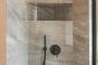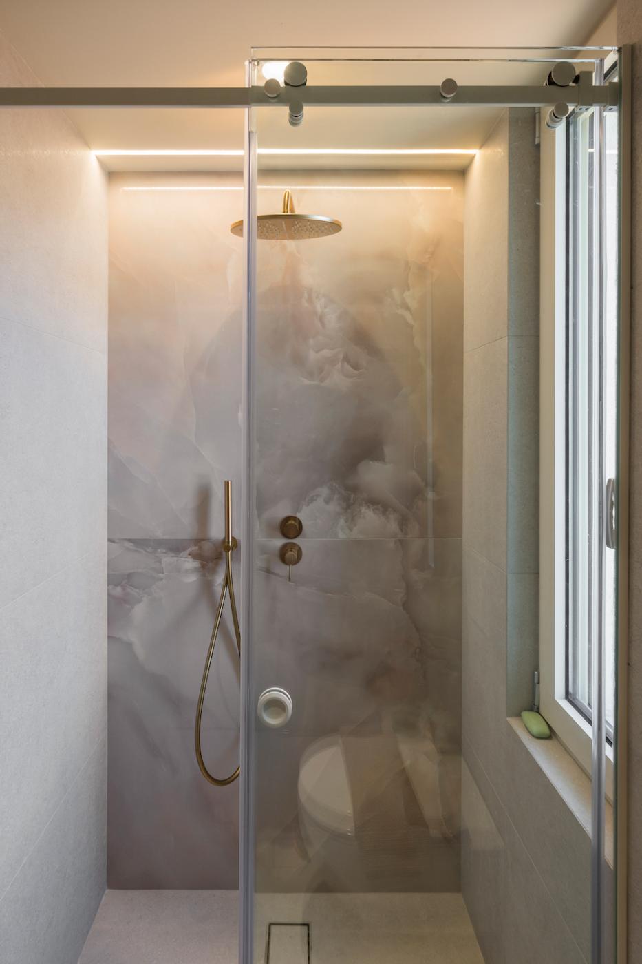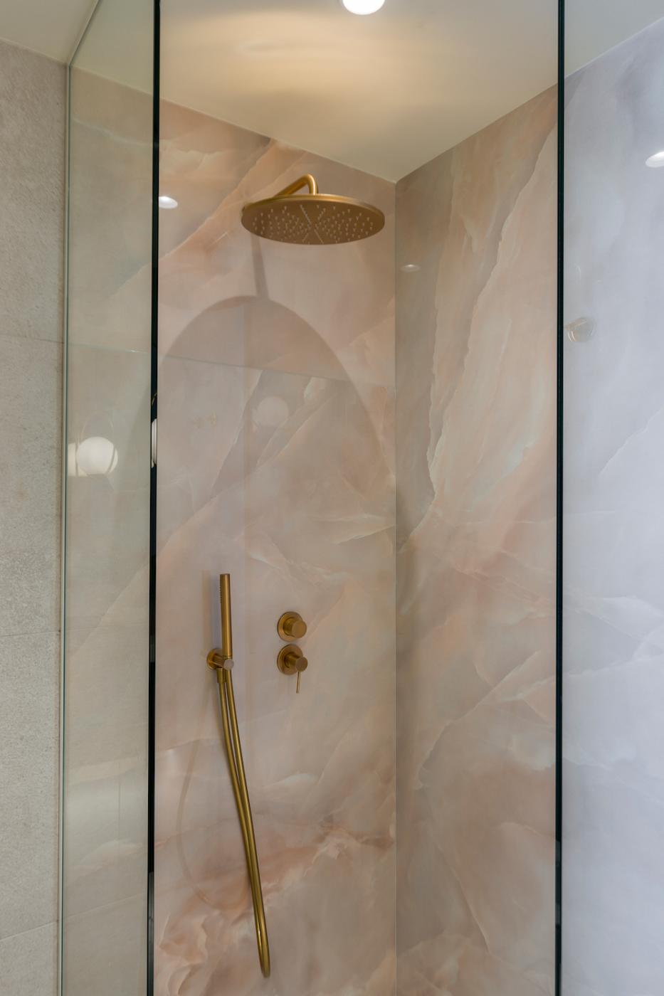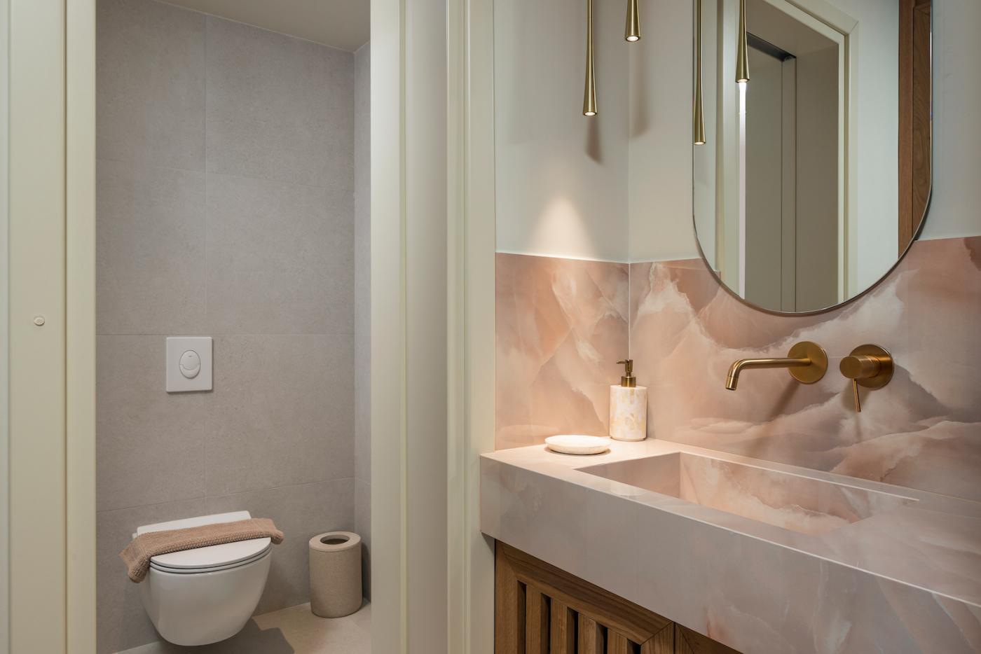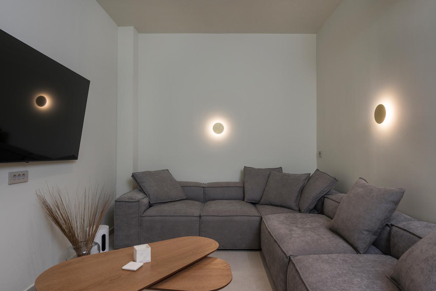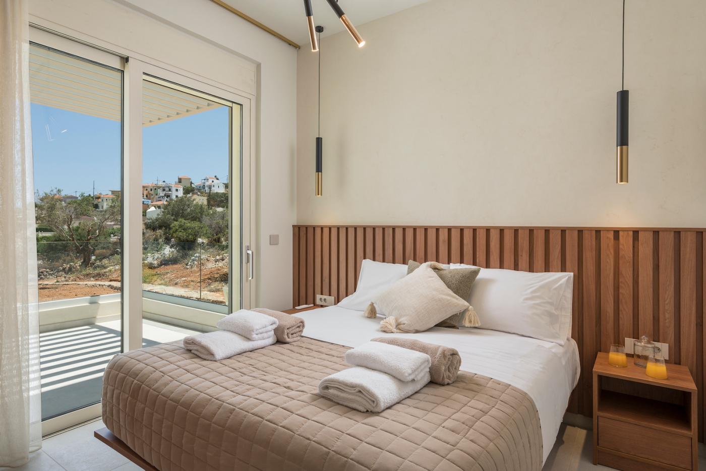 This villa offers a perfect blend of modern design and natural Cretan terrain, with the use of onyx, luxurious gold details, natural stone, iroko decking, and bespoke furniture constructions throughout the house. The luxury bespoke lighting fixtures add to the overall ambiance of the villa.