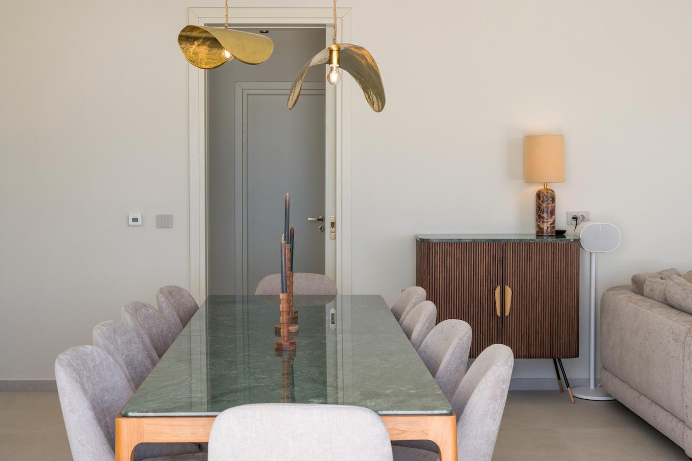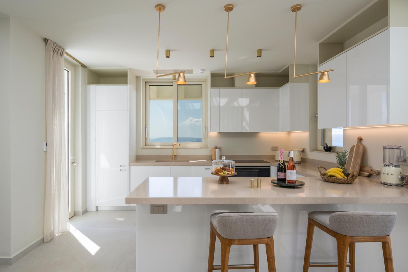 The villa features a cinema room with a smart TV of 65 inches and a Playstation 5. The living room also features a smart TV of 55 inches. The fully equipped kitchen with Smeg appliances provides the perfect space to cook and dine with friends and family.