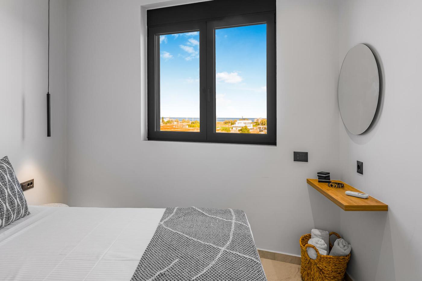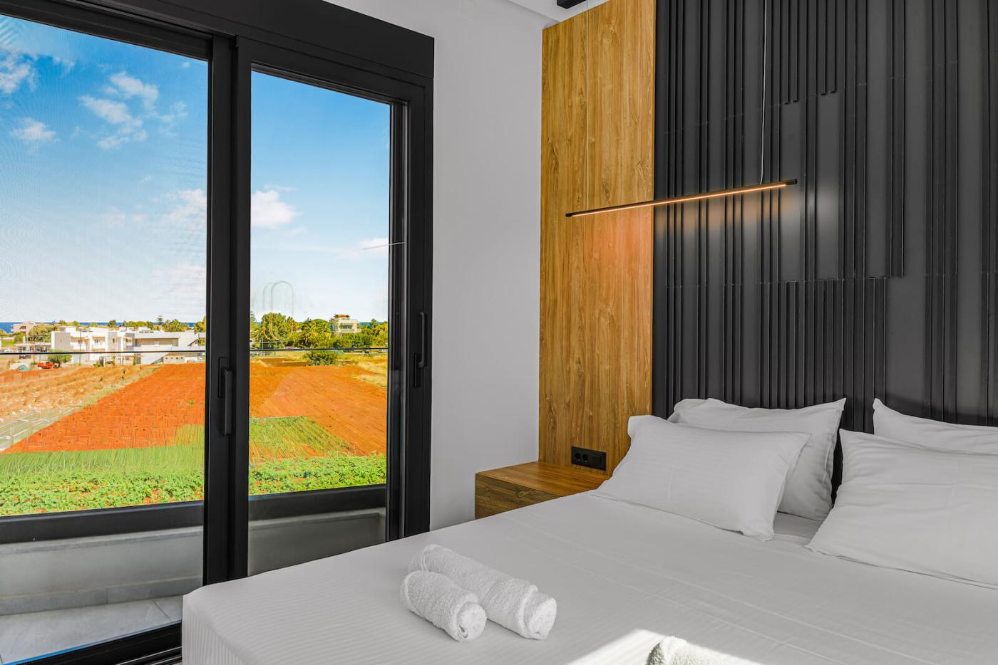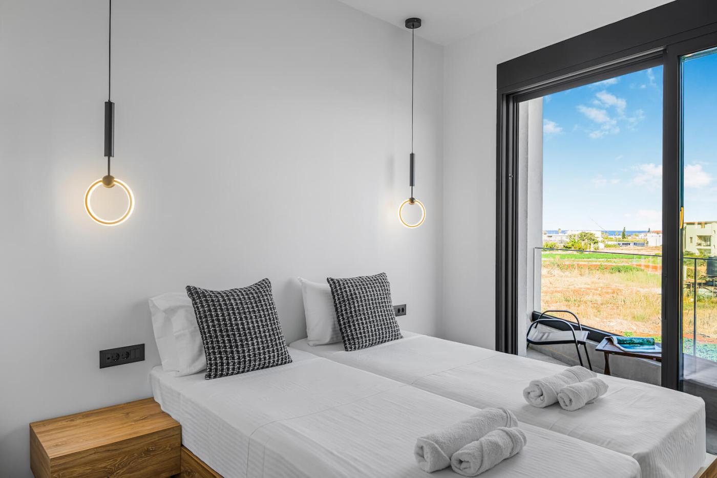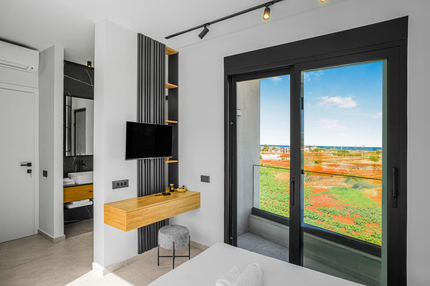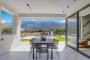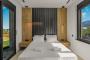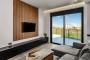 Two bedrooms open onto private balconies with stunning views, one of which also enjoys mountain views through a large window. Another bedroom boasts a large picture window with uninterrupted sea views, filling the villa with natural light and a serene atmosphere throughout the day.