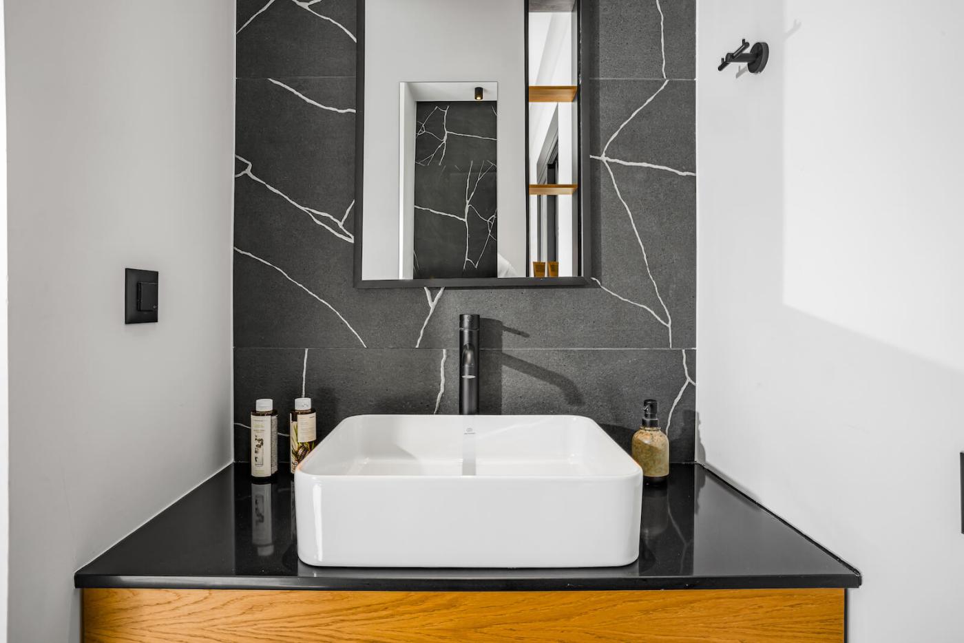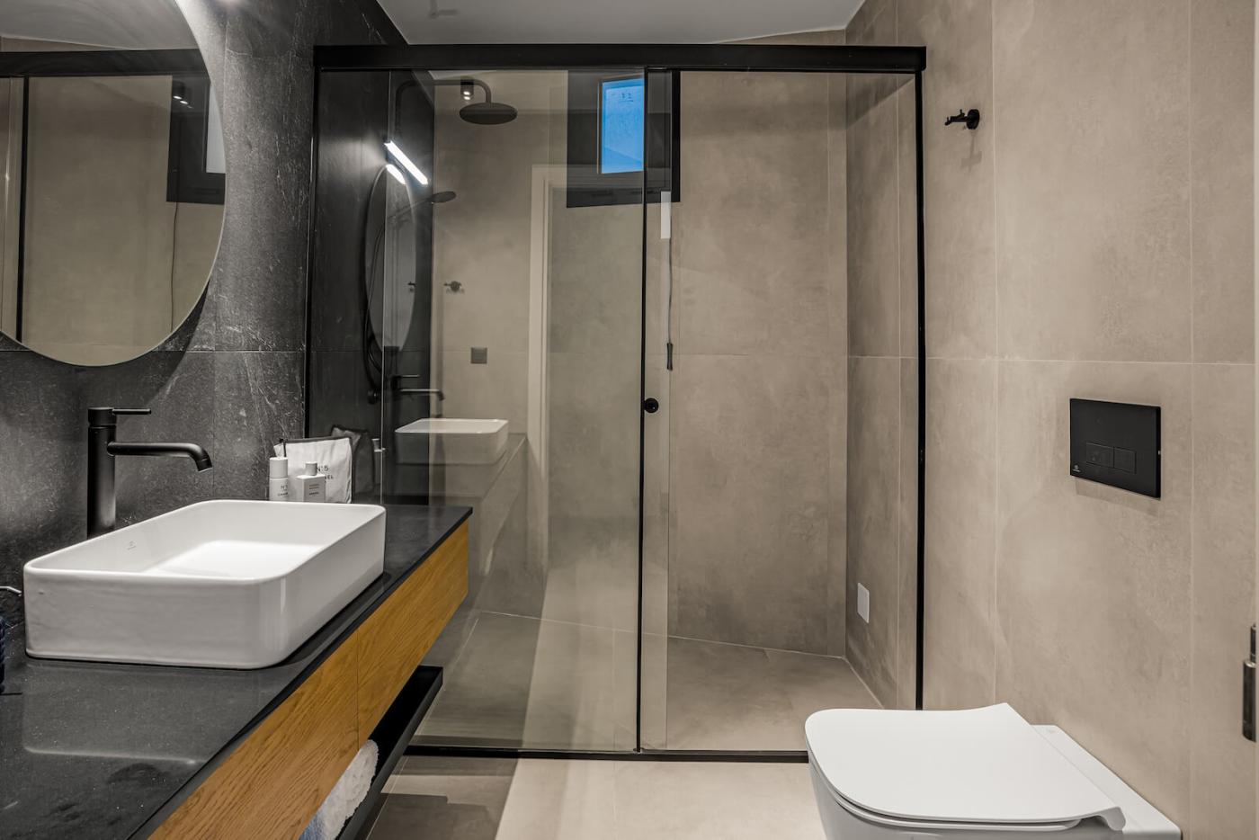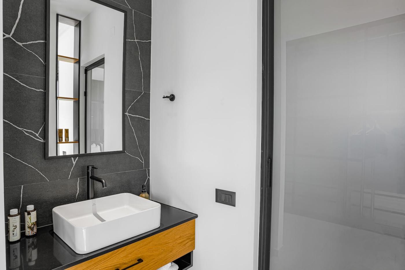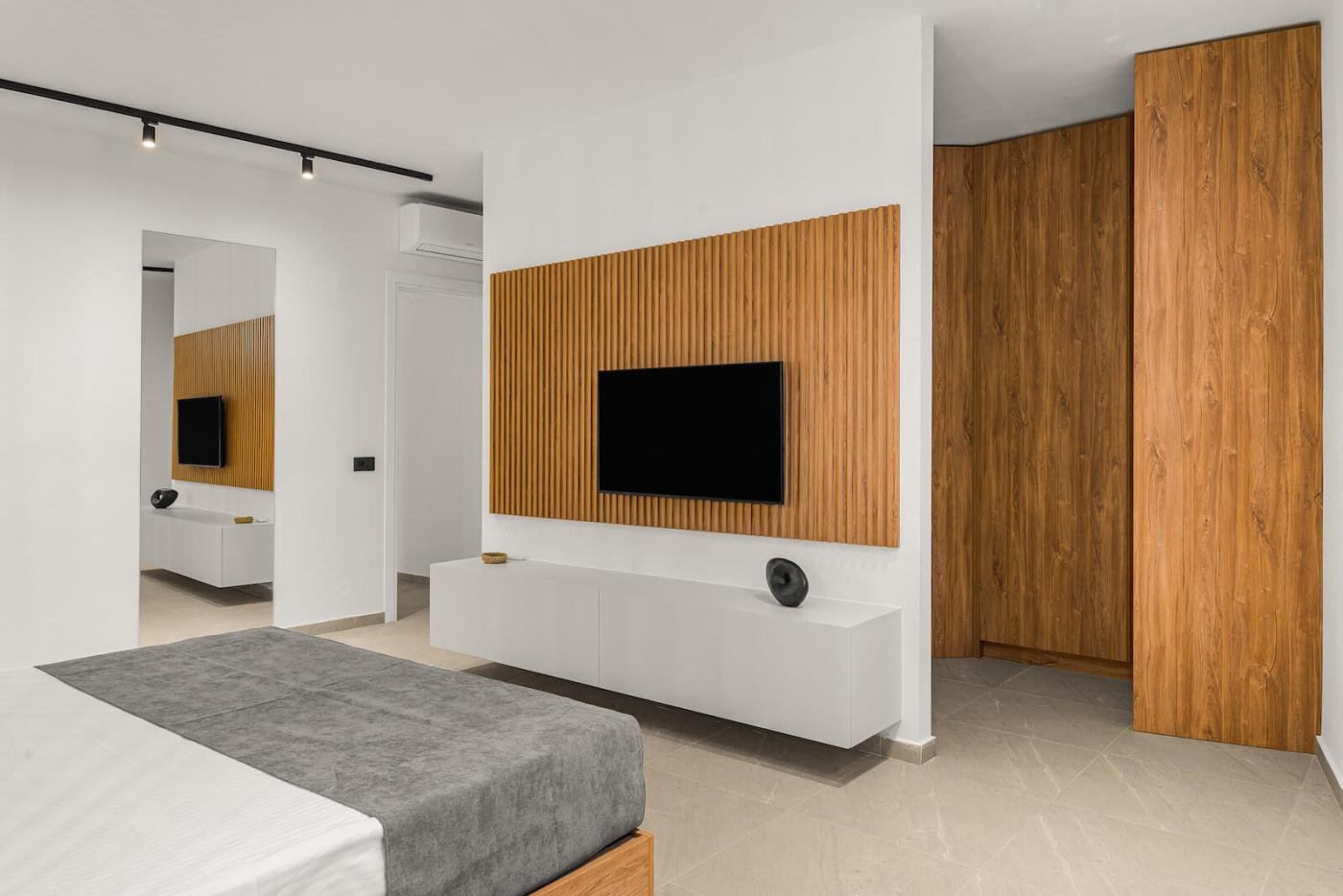 Two bedrooms open onto private balconies with stunning views, one of which also enjoys mountain views through a large window. Another bedroom boasts a large picture window with uninterrupted sea views, filling the villa with natural light and a serene atmosphere throughout the day.