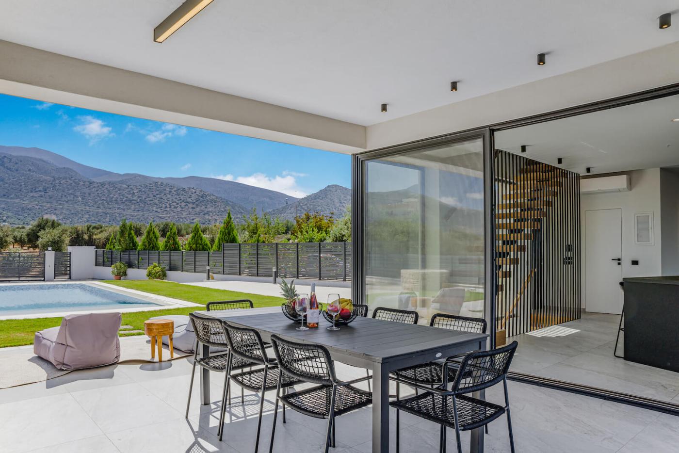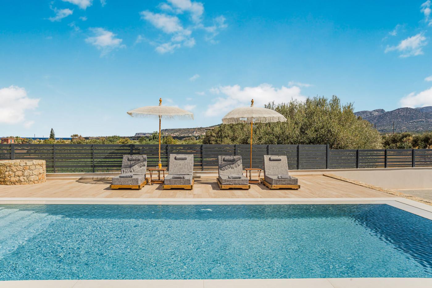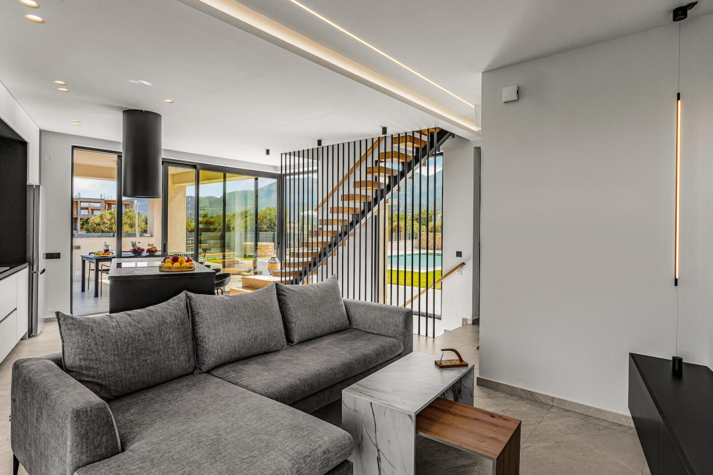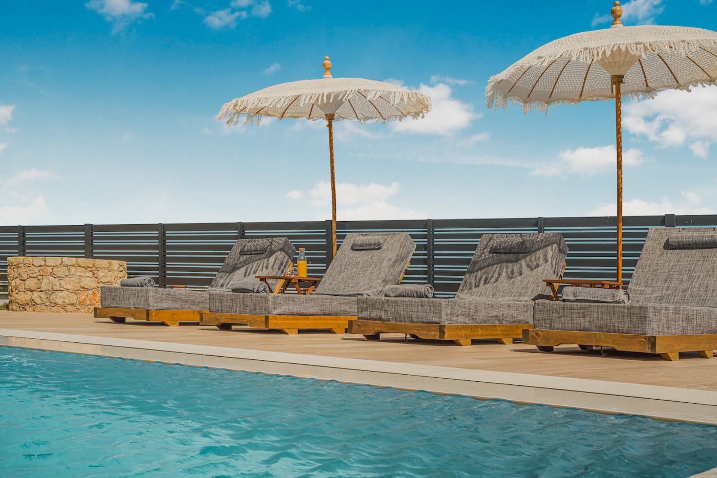Step outside to your private 40 sqm swimming pool, equipped with an electrolysis system, ensuring that the water is clean and free of chemicals.surrounded by sun loungers and a spacious deck. The outdoor terrace offers a large dining table seating up to 12 guests, ideal for al fresco meals while enjoying panoramic sea views and memorable sunsets.