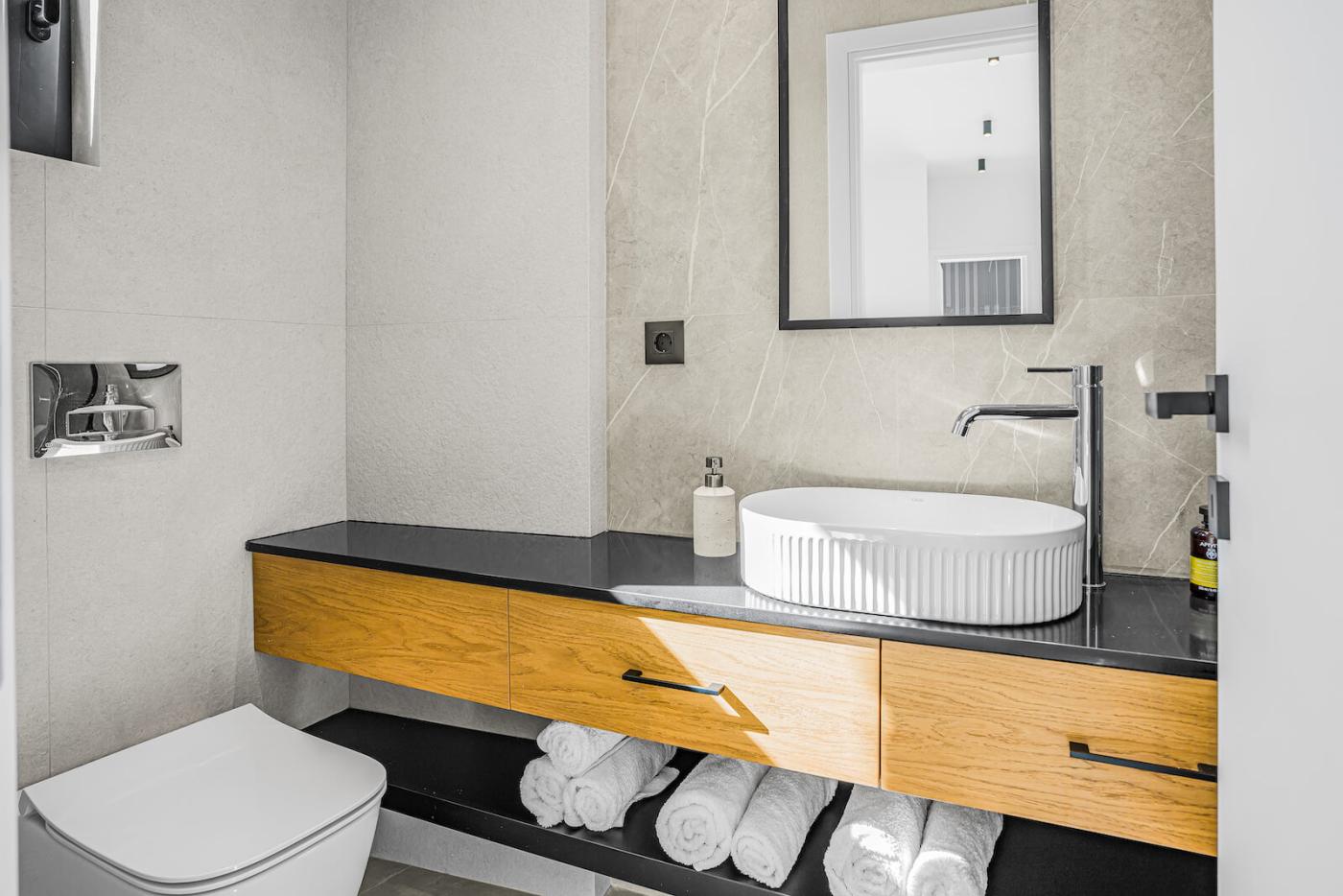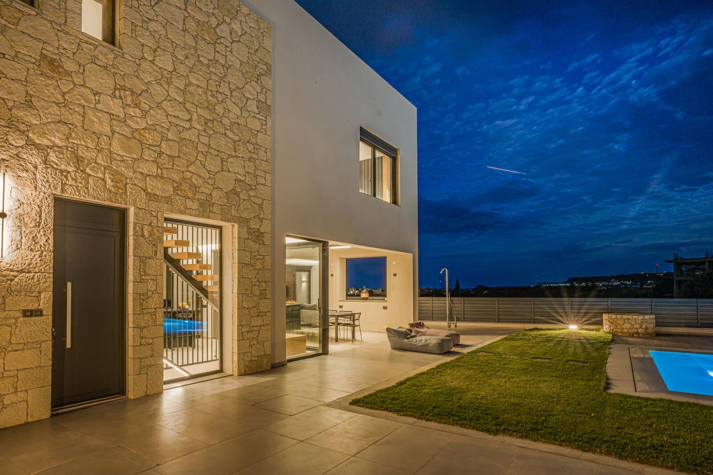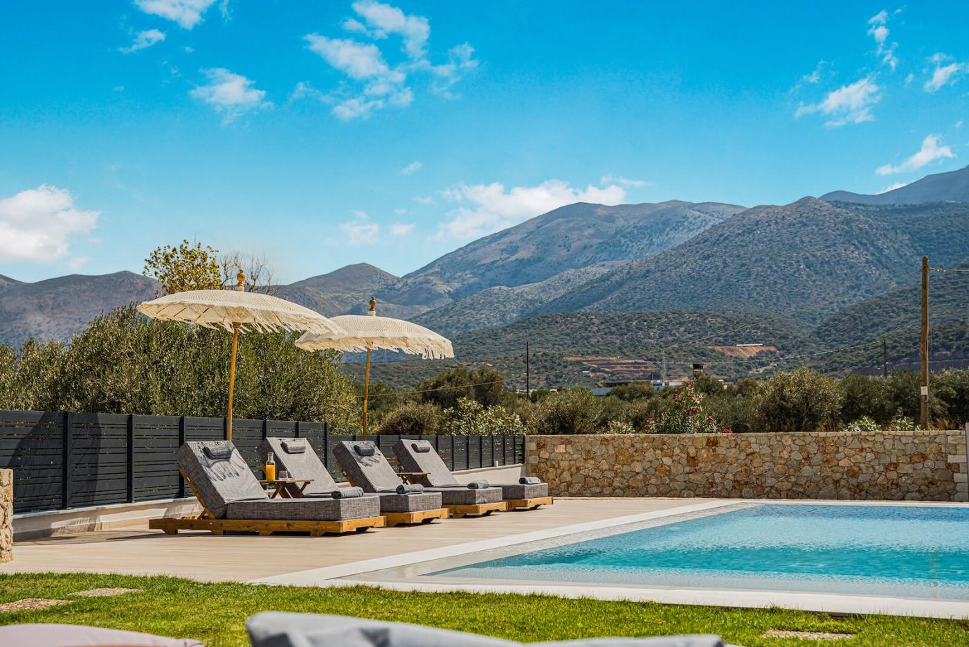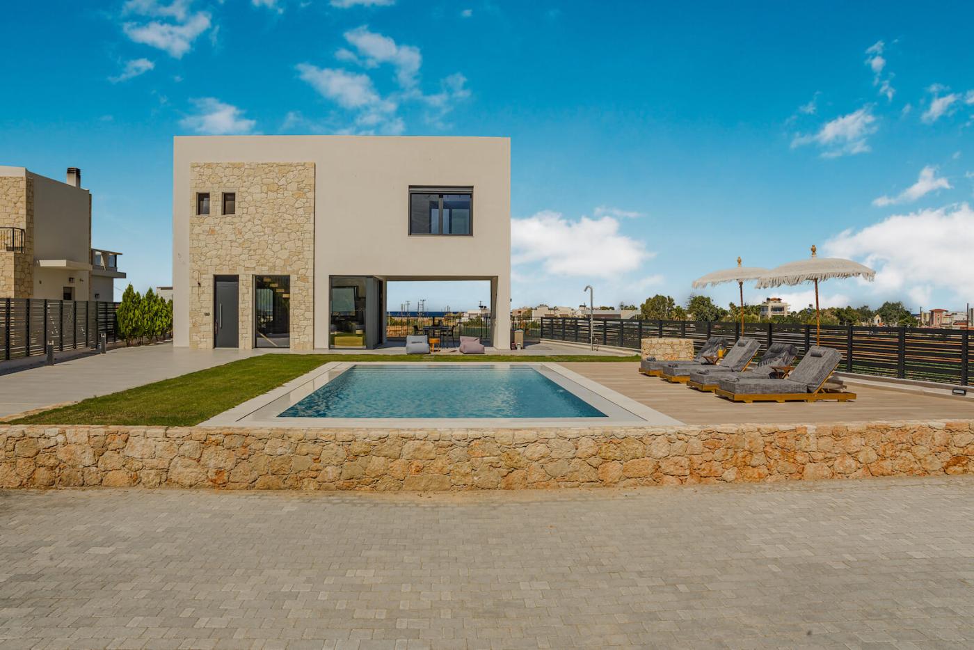 Step outside to your private 40 sqm swimming pool, equipped with an electrolysis system, ensuring that the water is clean and free of chemicals.surrounded by sun loungers and a spacious deck. The outdoor terrace offers a large dining table seating up to 12 guests, ideal for al fresco meals while enjoying panoramic sea views and memorable sunsets.