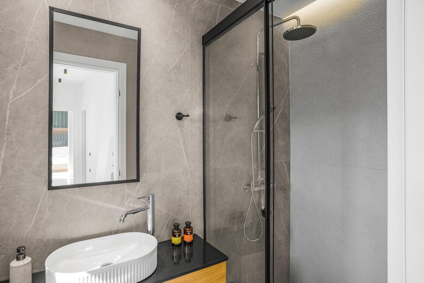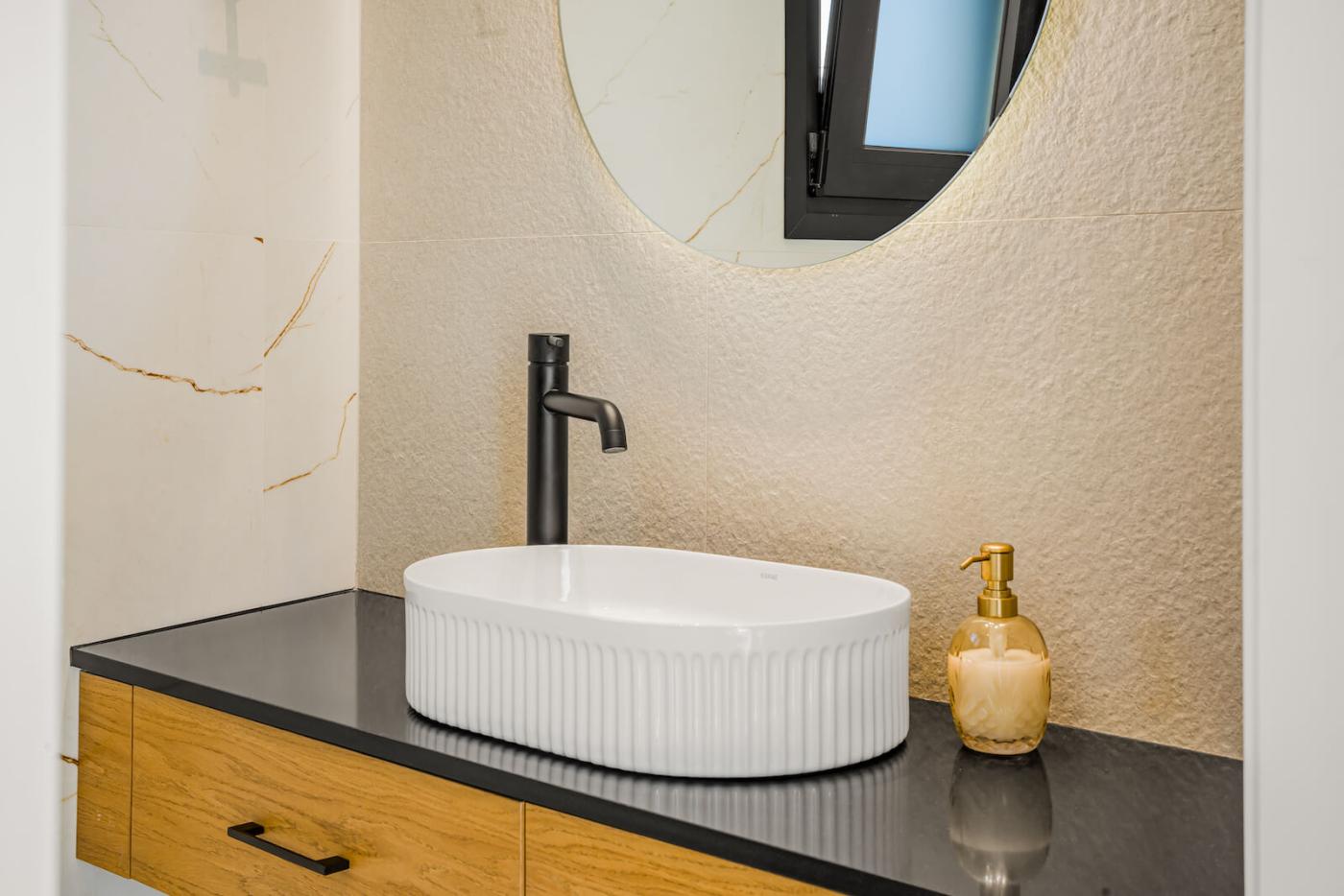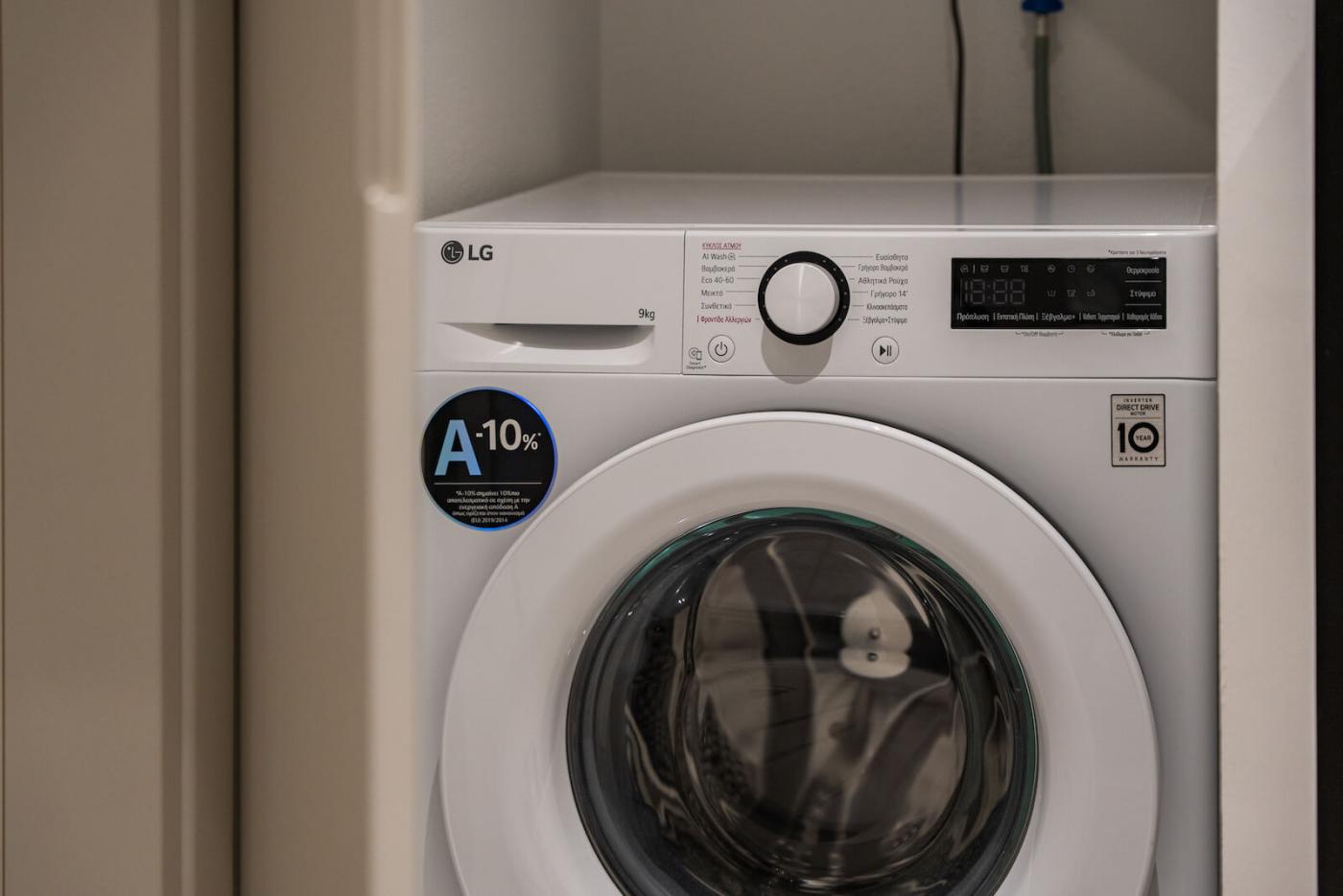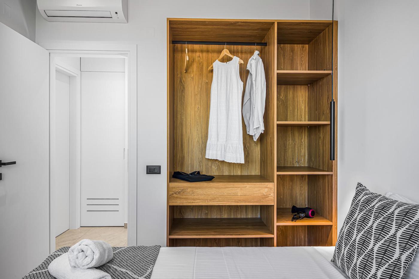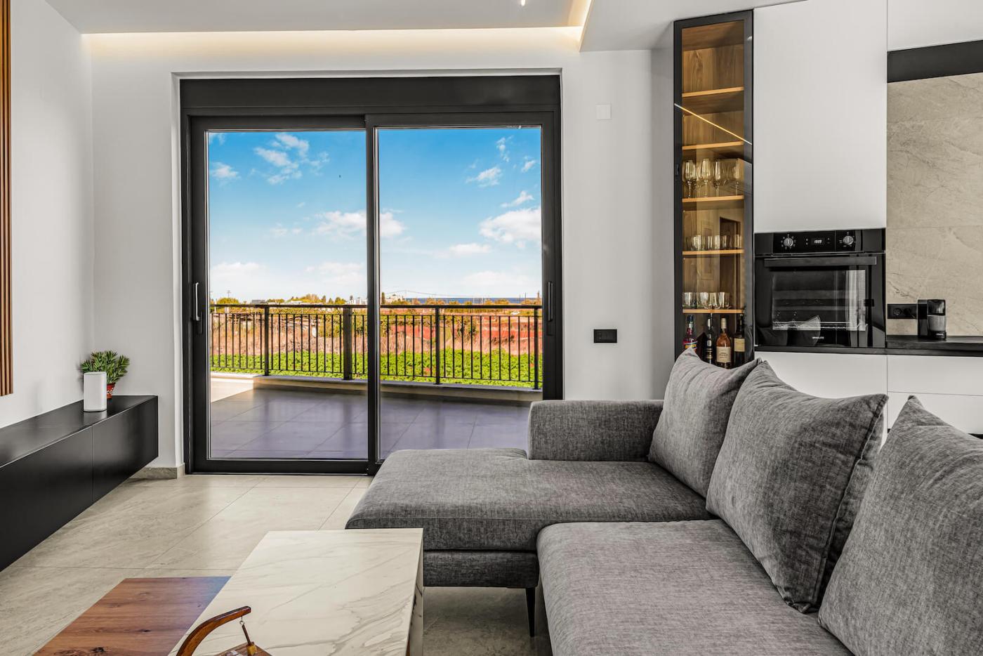 The fully equipped modern kitchen is fitted with high-quality appliances, including a Bosch oven, refrigerator, and dishwasher, as well as a kettle, washing machine, and ironing facilities—perfect for both short stays and longer holidays. The inviting living area features a comfortable sofa, Samsung TV, high-speed internet, while two of the bedrooms are also equipped with TVs.
