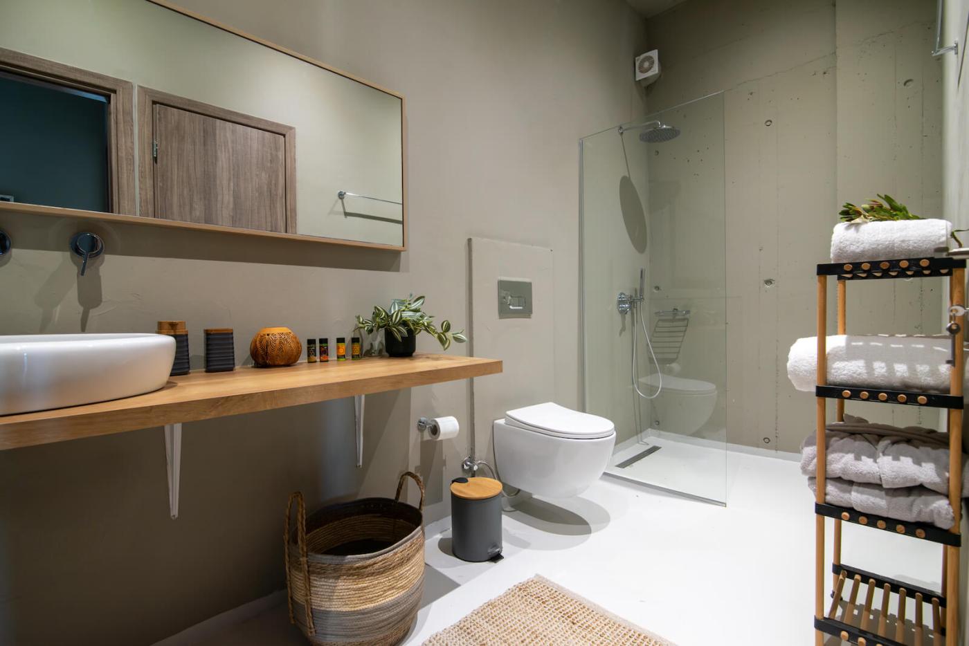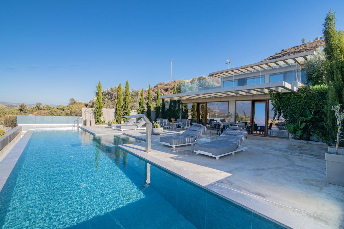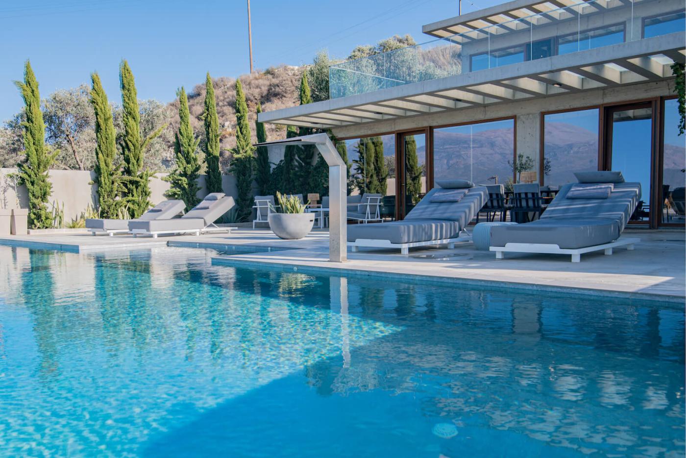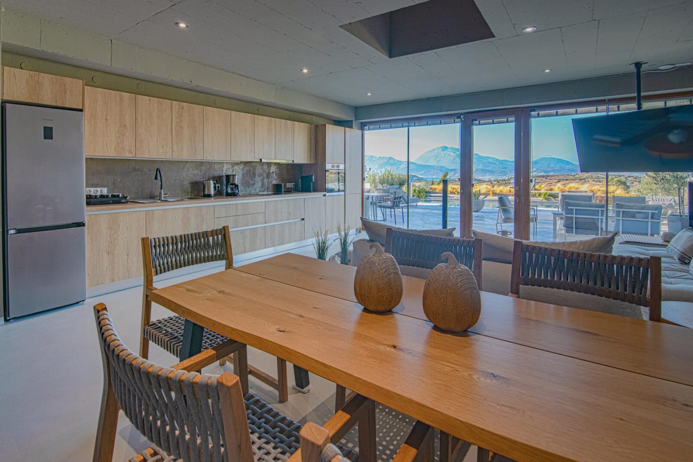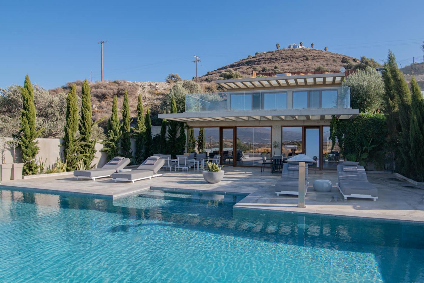 Marnos Green Luxury Grand Villa is the largest villa within the Marnos Green Luxury Villas complex. Nestled on a picturesque hillside, this three-bedroom maisonette is immersed in nature, offering stunning views of olive groves and the Libyan Sea. Designed with bioclimatic architecture in mind, the villa combines modern aesthetics with eco-conscious principles to harmonize with the environment. Warm wood accents, natural materials, and minimalistic concrete surfaces blend seamlessly with large modern artworks, creating a serene yet sophisticated atmosphere.